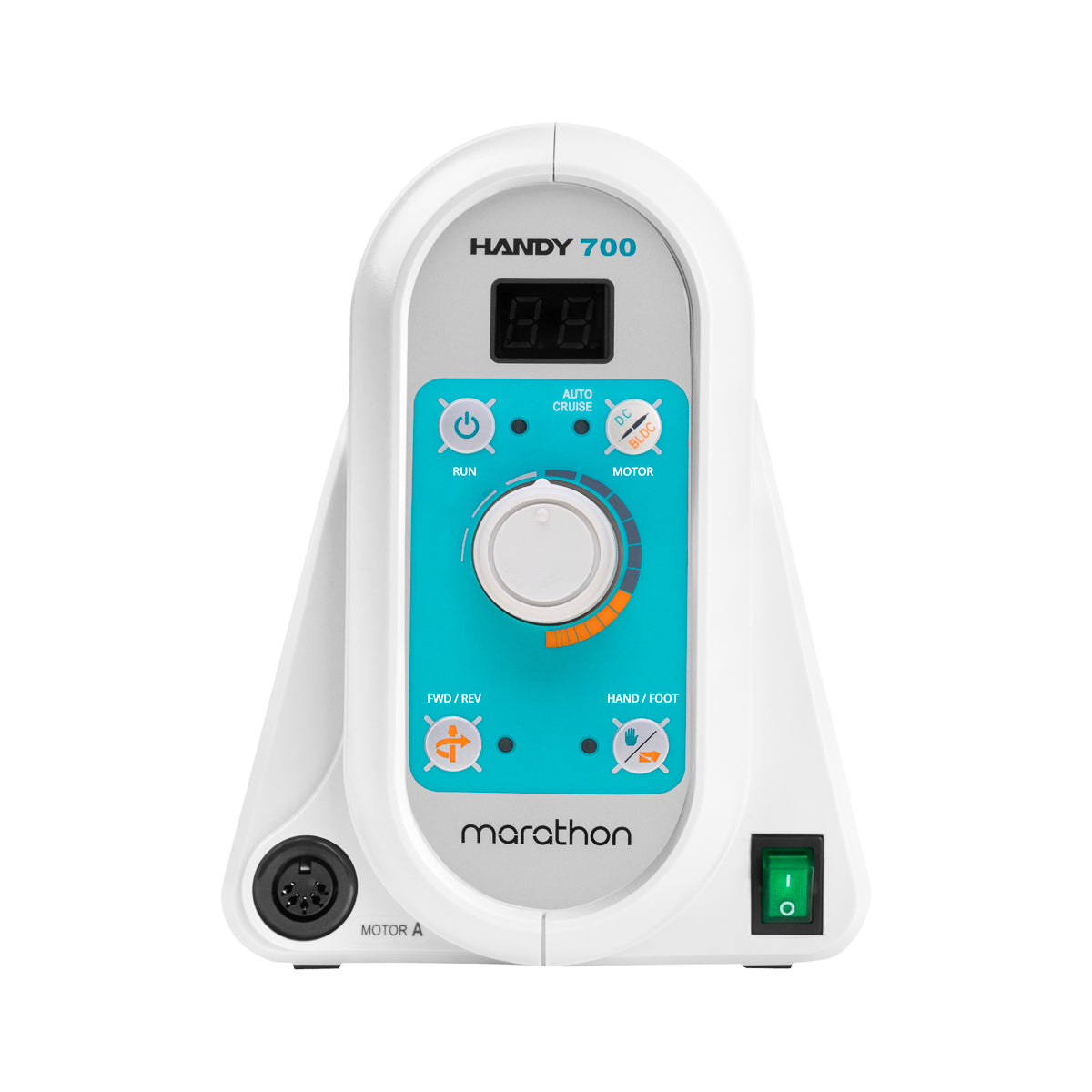 Handy 700 protēžu nagu urbšanas mašīna piedāvā augstu jaudu 100W un klusu darbību. Tā nodrošina augstu ātrumu līdz 50 000 apgriezieniem minūtē. Darbs ar šo nagu urbšanas mašīnu ir ārkārtīgi ērts, jo rokas gabala mikromotorā ir iebūvēta trokšņu samazināšanas sistēma, kas samazina trokšņus par 20% salīdzinājumā ar parastajiem modeļiem. Mašīnas vadības bloks ir ergonomiskas formas, tam ir praktiska roktura pārvadāšanai un rokas gabala turētājs.