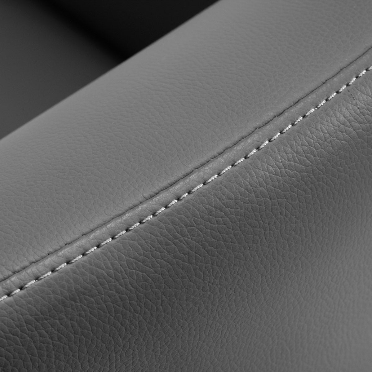 Krēsls ir pildīts ar putām, kas ir izturīgas un nezaudē formu, nodrošinot ērtu lietošanu ilgāku laiku. Apdare ir izgatavota no patīkamas pieskārienam imitācijas ādas ar specifisku struktūru. Pateicoties šāda materiāla izmantošanai, aprīkojums ir izturīgs pret mitrumu, izturīgs un viegli tīrāms. Pārklājums pelēko toņos un dekoratīvie elementi zelta krāsā piešķir tam laikmetīgu eleganci. Tā izteiksmīgā klasiskā apdare padara to lielisku gandrīz jebkurā telpā.