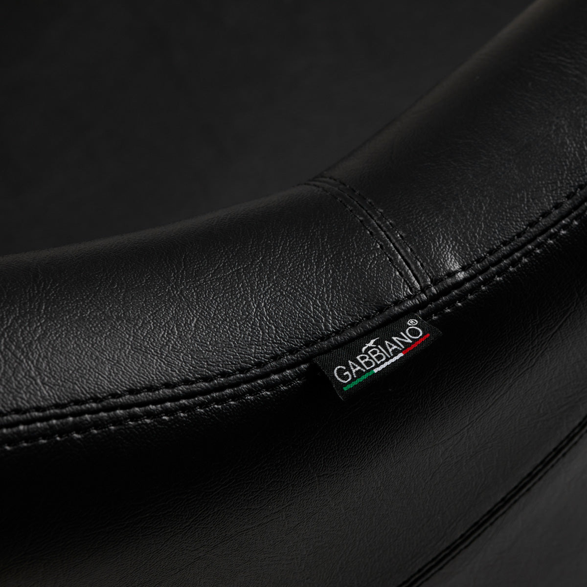 Krēsls ir pildīts ar putām, kas ir izturīgas un nezaudē formu, nodrošinot ērtu lietošanu ilgāku laiku. Apdare ir izgatavota no patīkama pieskāriena mākslīgās ādas ar specifisku struktūru. Pateicoties šāda materiāla izmantošanai, aprīkojums ir izturīgs pret mitrumu, izturīgs un viegli tīrāms. Pārklājums melnās krāsas toņos un dekoratīvie elementi zelta tonī piešķir tam mūžīgas elegances