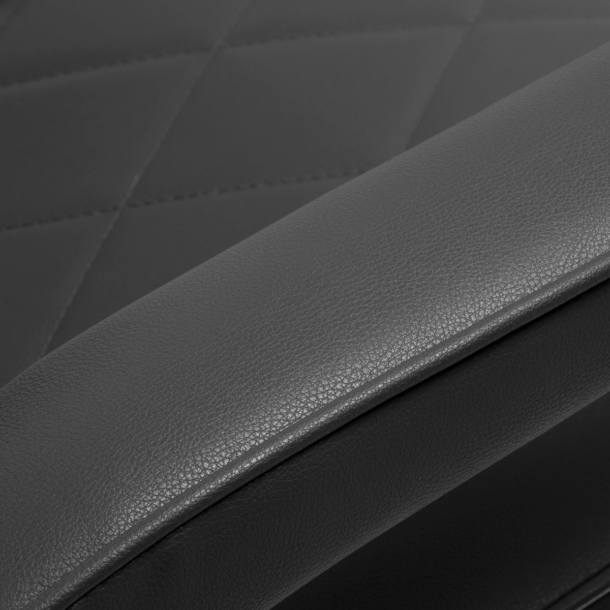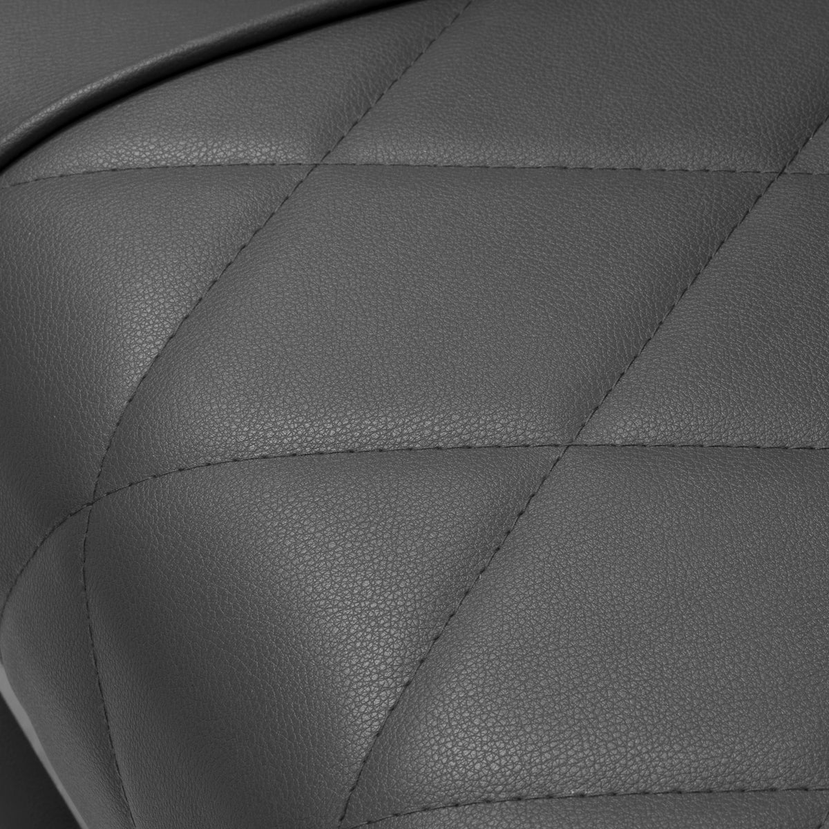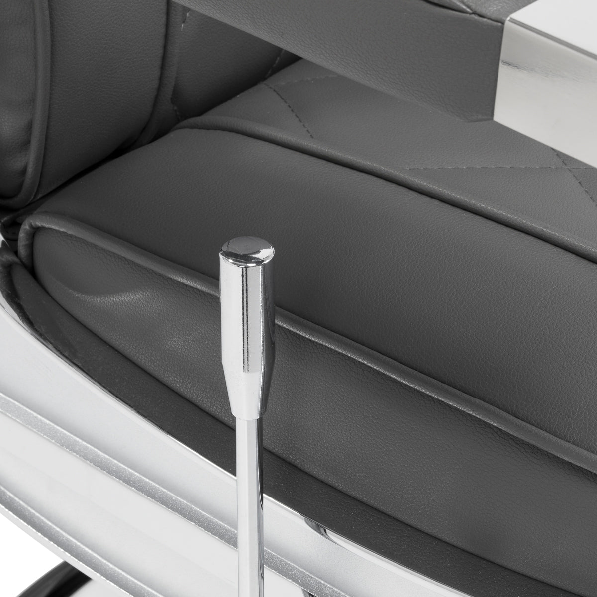 Krēsla cietā apaļā pamatnes konstrukcija nodrošina stabilitāti un izcilu lietotāja komfortu. Sēdekļa pildījums, izgatavots no deformācijizturīgas putas, un apdare no mīkstas pieskāriena sintētiskās ādas ar matētu virsmu nodrošina ilgmūžību un komfortu ilgstošas lietošanas laikā. Stilīgas šuves uz apdares piešķir raksturu, iedvesmojoties no automobiļu dizaina, kas uzlabo tā eleganto izskatu. Šī īpašība arī padara krēslu mitrumizturīgu, izturīgu un viegli tīrāmu. Apdare pelēkās toņos piešķir krēslam unikālu raksturu, un tā minimālistiskais stils ļauj tam nevainojami saplūst ar jebkuras frizētavas interjeru.