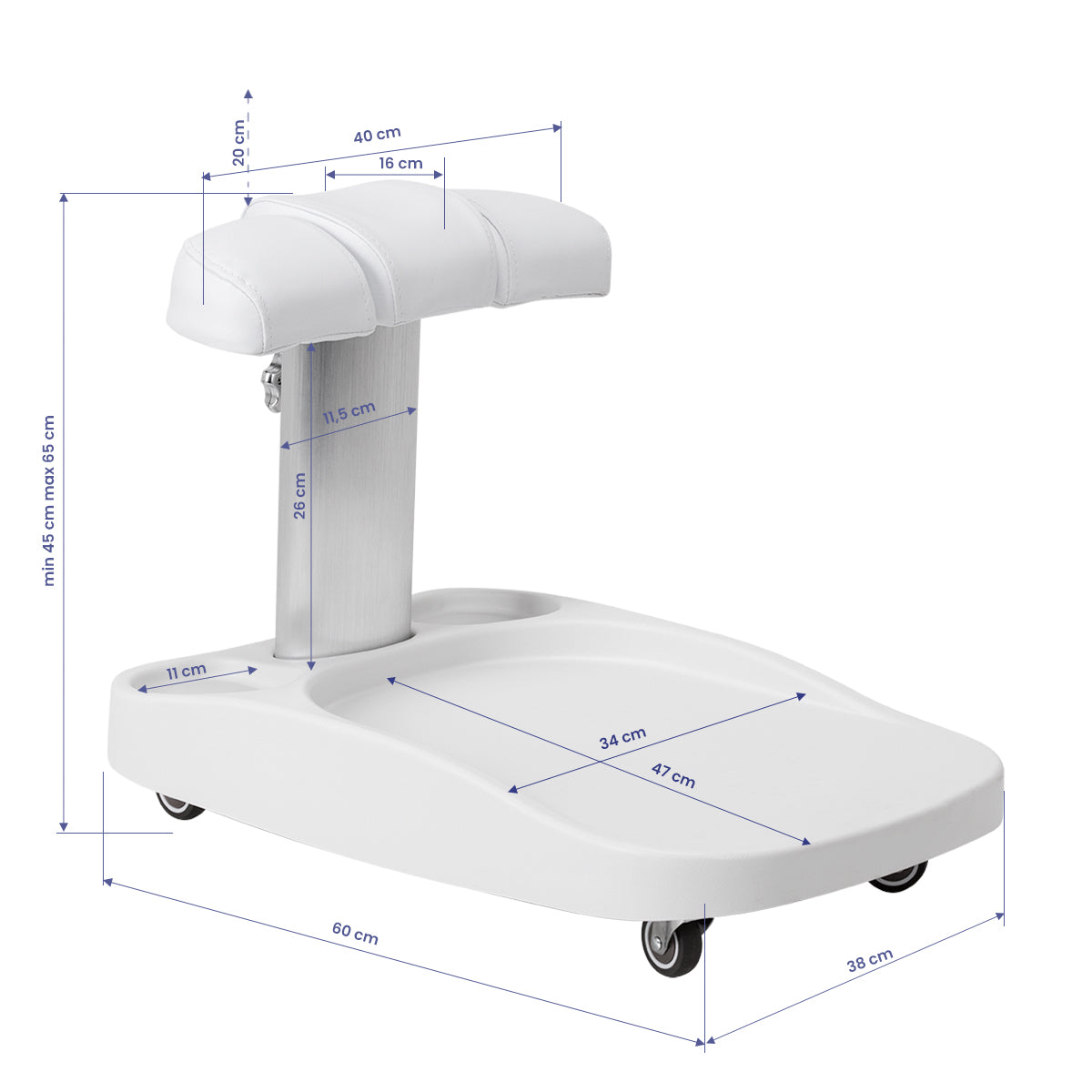 Kāju balsts sastāv no trim daļām, no kurām vidējā ir izvelkama. Manuāla augstuma regulēšana ļauj to pacelt līdz pat 20 cm. Visi kāju balsta elementi ir apšūti ar sintētisko ādu, kas nodrošina izturību pret mitrumu un vieglu tīrīšanu. Rezultātā ratiņus var pielāgot lietotāja individuālajām vajadzībām, kas padara tos par lielisku risinājumu gan kosmētiskām, gan podiatrijas procedūrām, nodrošinot komfortu un precizitāti darbā dažādās pozīcijās.
