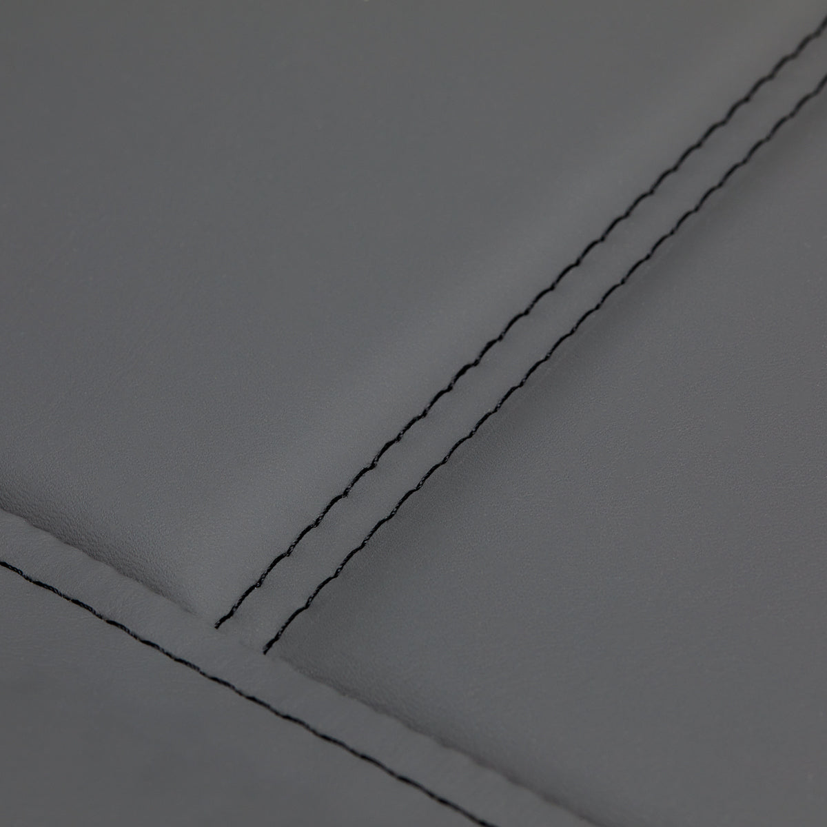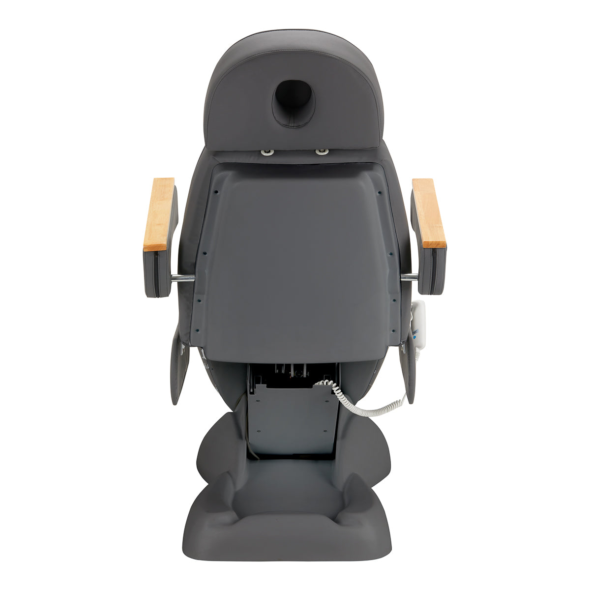 Krēsls ir piepildīts ar piemērotas cietības putām un pārklāts ar patīkamu pieskārienam imitācijas ādu pelēko toņu variācijās. Pateicoties materiāla izmantošanai, kas ir viegls tīrīšanā un izturīgs pret izvēlētiem dezinfekcijas līdzekļiem, aprīkojums ir ērti lietojams, izturīgs pret mitrumu un viegli tīrāms. Stabils pamats no izturīga materiāla pelēko toņu variācijās nodrošina stabilitāti procedūru laikā. Dekoratīvi koka elementi uz roku balstiem izceļ krēslu no citiem modeļiem, būdami vizuāli pievilcīgs, elegants akcents. Pareizi profilētas apmales piešķir krēslam stilīgu izskatu un padara sēdekli ergonomisku.