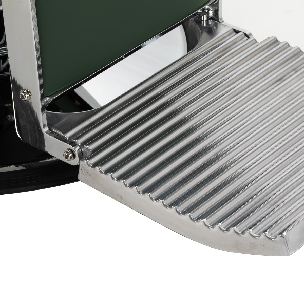 Stabilā pamatnes konstrukcija nodrošina stabilitāti un augstu komfortu. Sēdeklis ir pildīts ar deformācijizturīgu putu materiālu un apšūts ar mīkstu, matētu sintētisko ādu, apvienojot izturību ar komfortu. Apdares materiāli ir mitrumizturīgi, izturīgi un viegli kopjami, padarot krēslu ideāli piemērotu ikdienas lietošanai. Stilīgas šuves un apšuvums zaļā toņos piešķir tam unikālu raksturu, kas lieliski sader ar mūsdienīgu frizētavu interjeru.