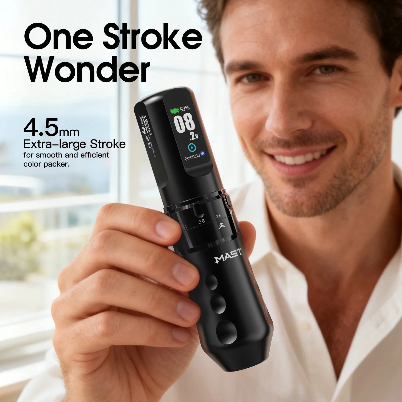Mast Flip 4 Pro bezvadu tetovēšanas mašīna ir paredzēta māksliniekiem, kuriem nepieciešama maksimāla jauda, pielāgojamība un kontrole līniju vilkšanā, ēnošanā un krāsu pildīšanā. Ar 7 īstām zīmējuma garuma iespējām no 2,5 mm līdz 4,5 mm mākslinieki var uzreiz pielāgot zīmējuma garumu, izmantojot precīzo regulēšanas ritenīti, padarot Flip 4 Pro par patiesi visu stilu tetovēšanas risinājumu.