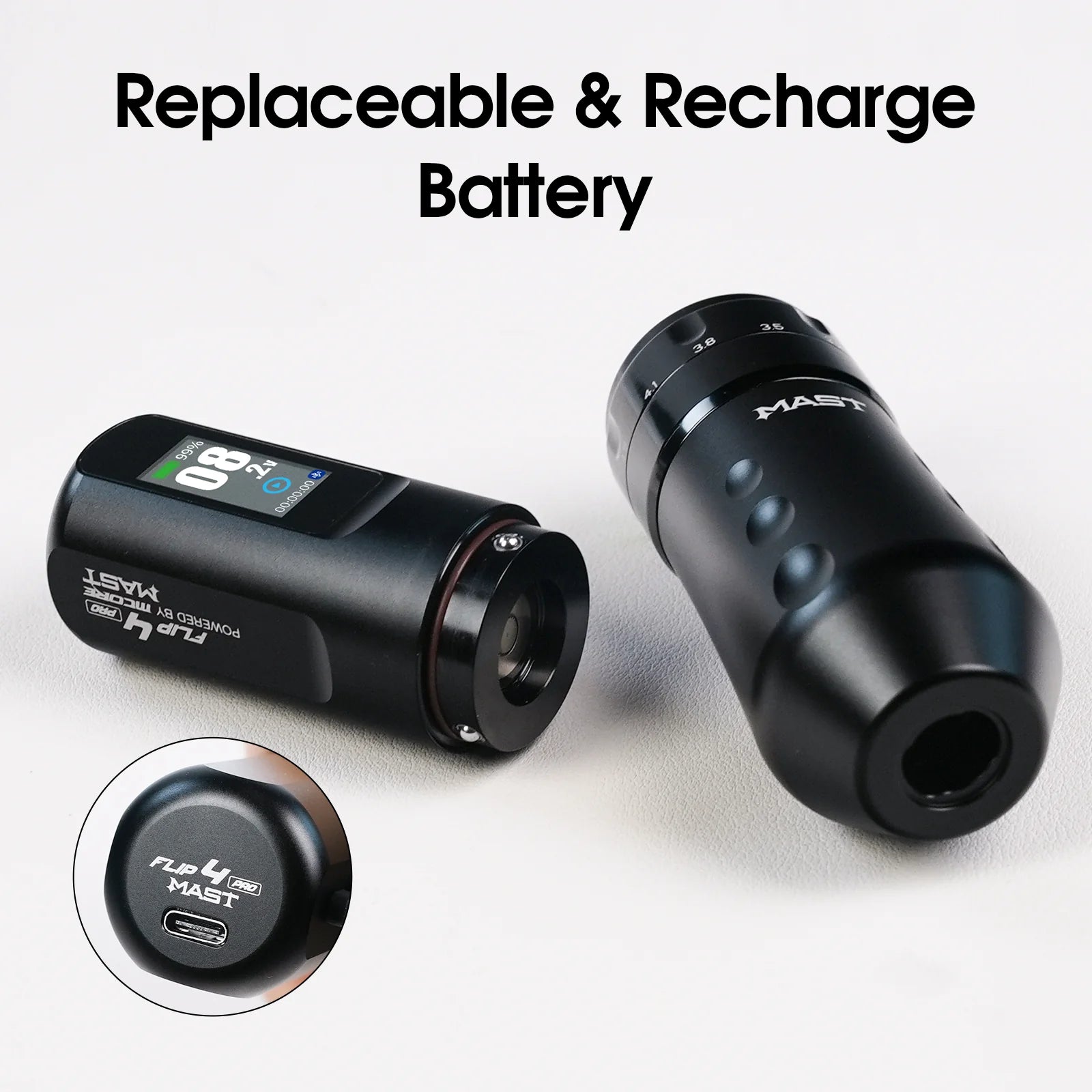 Aprīkots ar Mast Safe Tech, Flip 4 Pro nodrošina stabilu jaudas padevi, nepārtrauktu akumulatora aizsardzību un ātru uzlādi. Pie 8V mašīna var darboties līdz pat 7 stundām, savukārt pilna uzlāde aizņem tikai 1,5 stundas caur USB-C. Komplektā ar papildu akumulatoru sistēma atbalsta garas tetovēšanas sesijas bez pārtraukumiem, saglabājot vienmērīgu veiktspēju 4–12V darba diapazonā.