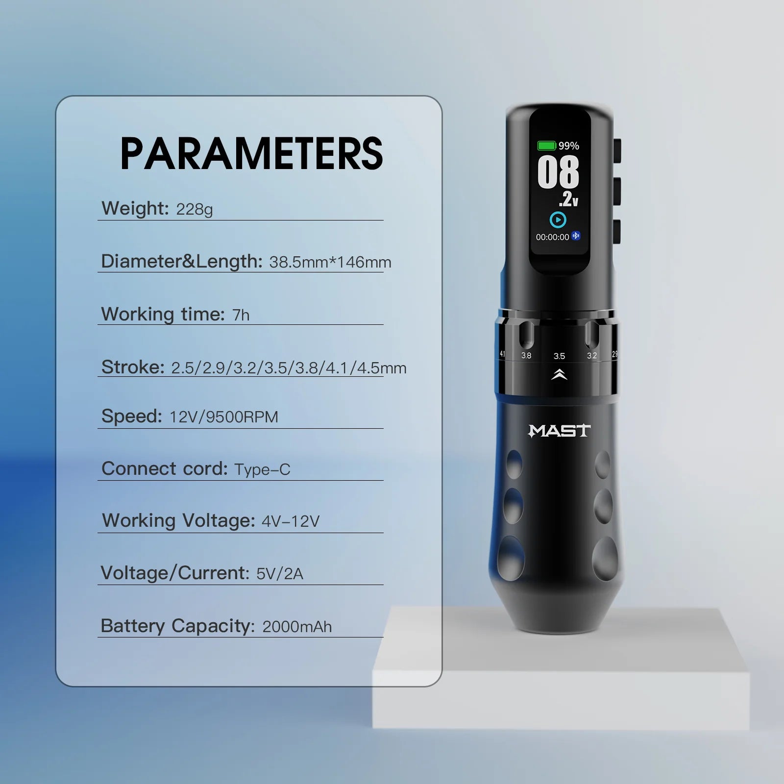 Augstas veiktspējas bezvadu tetovēšanas pildspalvas mašīna, izstrādāta prasīgiem profesionāliem darbiem, ar 7 regulējamām zīmējuma garuma pozīcijām līdz pat īstiem 4,5 mm, jaudīgu Mcore-C1.1 motoru un ilgmūžīgu divu akumulatoru atbalstu nepārtrauktām tetovēšanas sesijām.