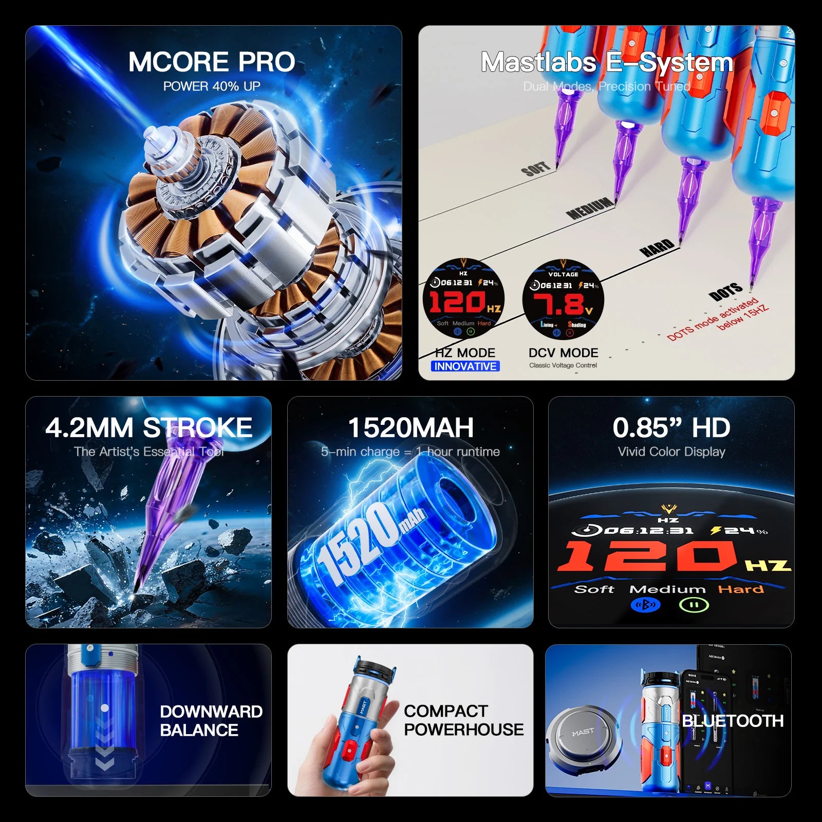 Modelis MAST Racer Pro Armor Edition darbojas ar uzlabotu MCORE Pro Super Motor, kas nodrošina līdz pat 40% lielāku adatas iespiešanās spēku labākai tintes piesātināšanai un vienmērīgu darbību visos tetovēšanas stilos. Šī uzlabotā motora efektivitāte ļauj māksliniekiem strādāt ātrāk, tīrāk un ar lielāku pārliecību prasīgās tehnikās.