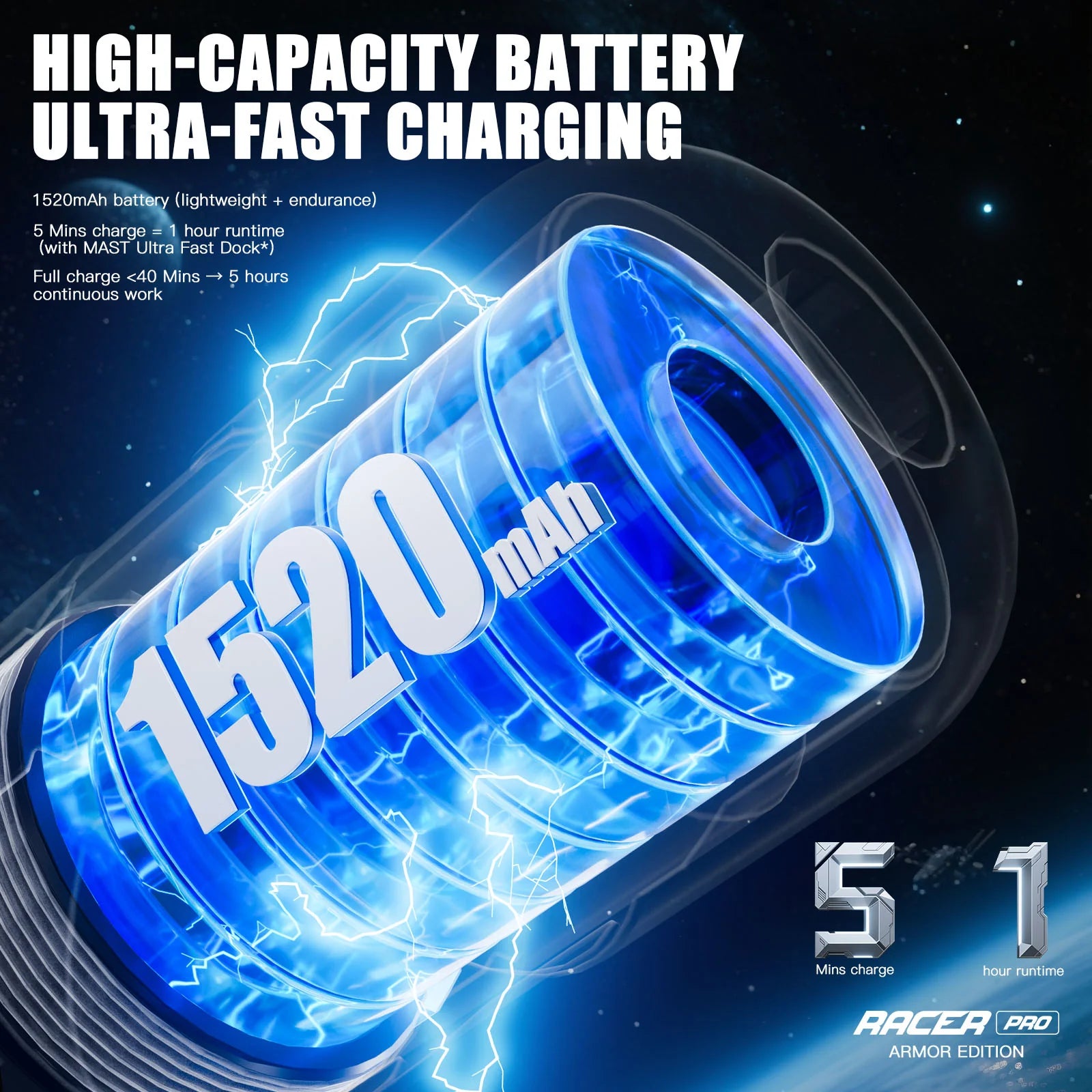 Aprīkots ar diviem 1520mAh akumulatoriem un MAST Ultra Fast Charging tehnoloģiju, Racer Pro nodrošina: