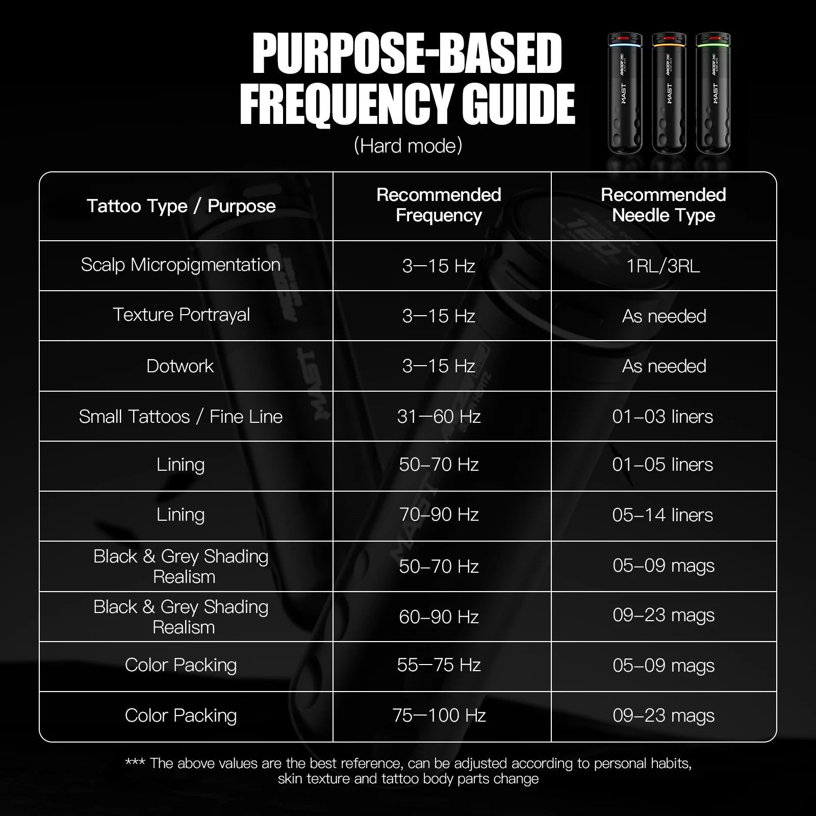 Hz režīms (3–140Hz) sinhronizē adatas kustību ar rokas kustību, nodrošinot atsaucīgu un stabilu kontroli – ar mīkstu, vidēju, cietu un punktveida iestatījumiem pielāgotai darbībai.