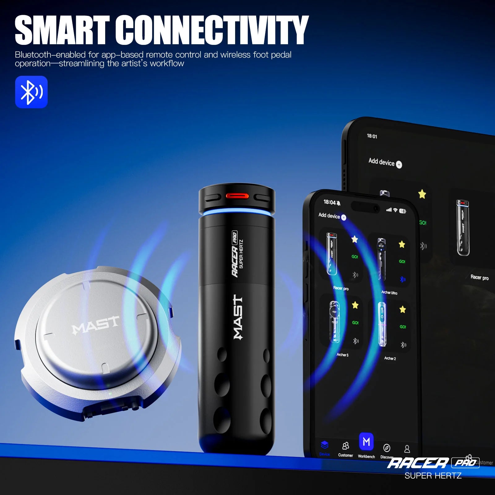 Aprīkots ar Bluetooth savienojumu, bezvadu kājas pedāļa atbalstu un asu 0,85” HD krāsu displeju, Mast Racer Pro dod pilnīgu kontroli jūsu rokās – ļaujot koncentrēties uz mākslu, nevis uz iestatīšanu. Izgatavots ilgmūžībai, viegls un radīts precizitātei, tas ir jauns profesionālu bezvadu tetovēšanas mašīnu standarts.