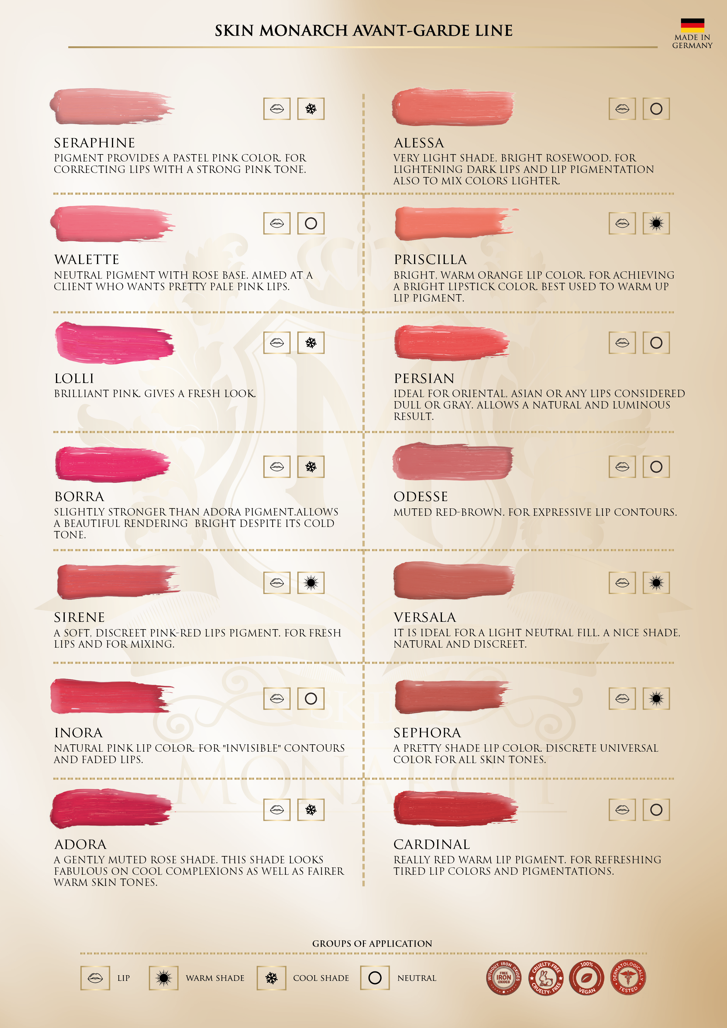Izstrādāts Skin Monarch Academy, šie augstākās kvalitātes Avant-Garde līnijas pigmenti ir izgatavoti no pasaules labākajām sertificētām sastāvdaļām. Bez dzelzs oksīdiem un pilnībā krāsu stabils, tie nodrošina izcilu veiktspēju, ilgstošu krāsu un vienmērīgu izbalēšanu laika gaitā.