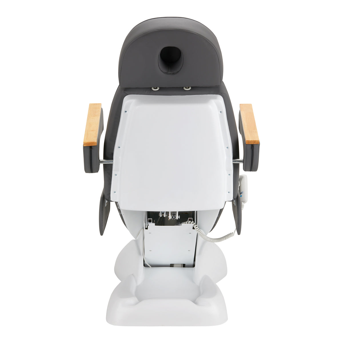 Krēsls ir piepildīts ar atbilstoša cietības putu materiālu un pārklāts ar patīkamu pieskārienam imitācijas ādu pelēko toņu toņos. Pateicoties materiāla izmantošanai, kas ir viegls tīrīšanai un izturīgs pret izvēlētiem dezinfekcijas līdzekļiem, aprīkojums ir ērts lietošanā, izturīgs pret mitrumu un viegli tīrāms. Stabils pamats no izturīga materiāla baltos toņos nodrošina stabilitāti procedūru laikā. Dekoratīvi koka elementi uz roku balstiem izceļ krēslu no citiem modeļiem, būdami vizuāli pievilcīgs, elegants akcents. Pareizi profilētas apmales piešķir krēslam stilīgu izskatu un padara sēdekli ergonomisku.