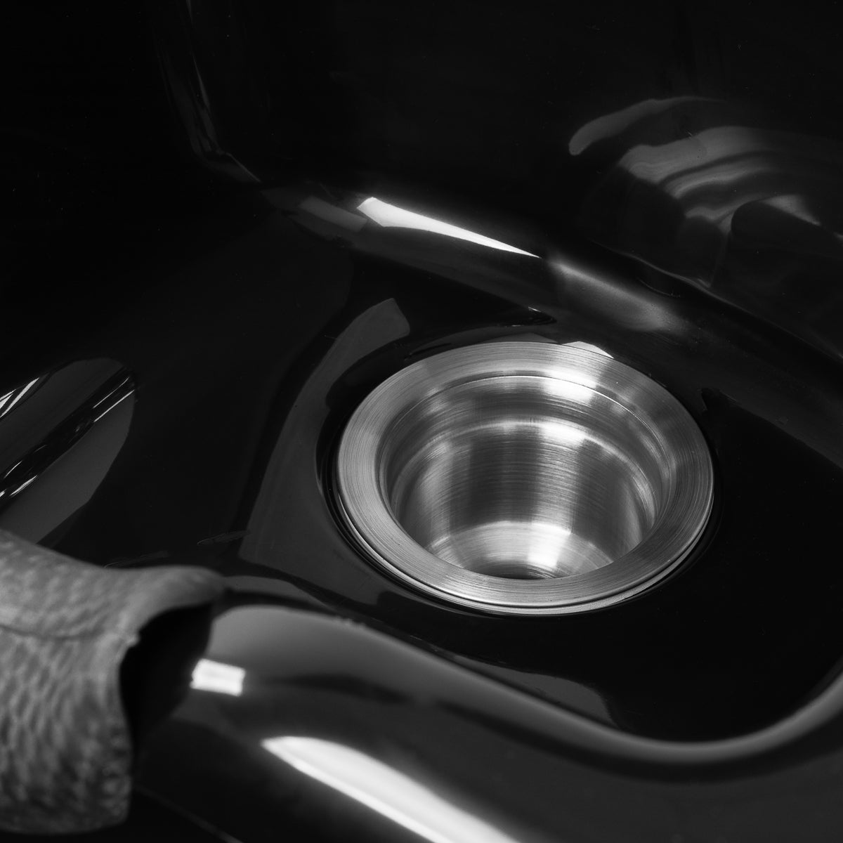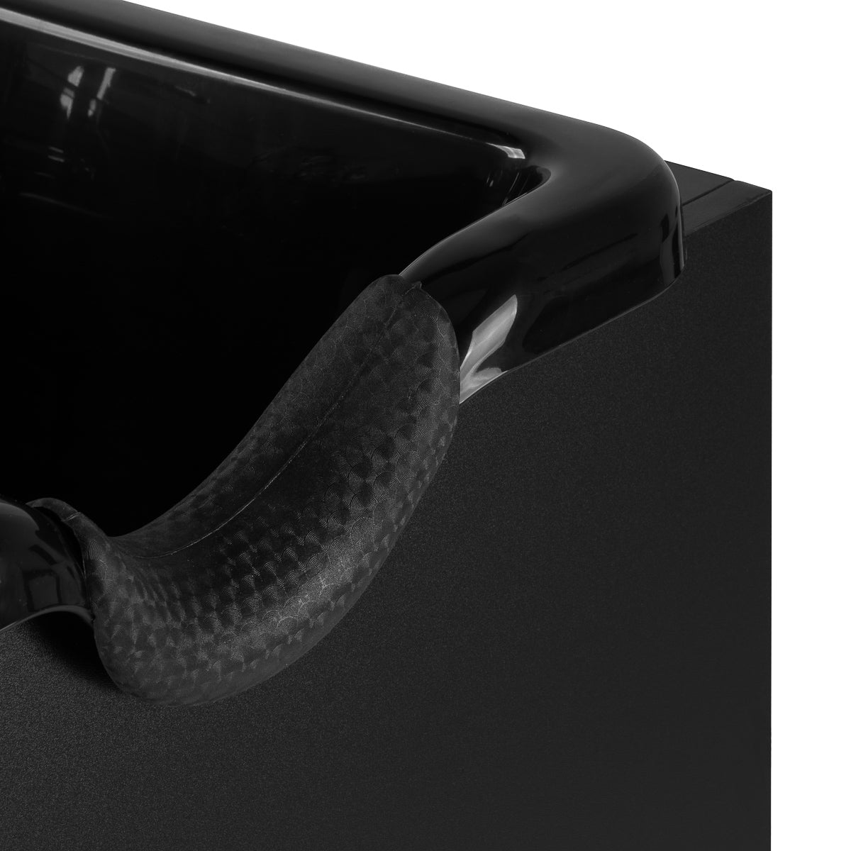 Dziļā melnā bļoda ir izgatavota no izturīgas plastmasas, kas padara to izturīgu pret bojājumiem un viegli tīrāmu. Tās pārdomātais dizains efektīvi samazina ūdens un līdzekļu šļakstīšanos mazgāšanas laikā. Ergonomiskais forma un profilētais apkaklītis ar silikona pārklājumu nodrošina klientam ērtu galvas pozīciju. Praktiska vieta dušas rozetes turēšanai palīdz labāk organizēt staciju, un uzmava ar sietiņu atvieglo ūdens plūsmas kontroli un uztur tīrību un higiēnu.