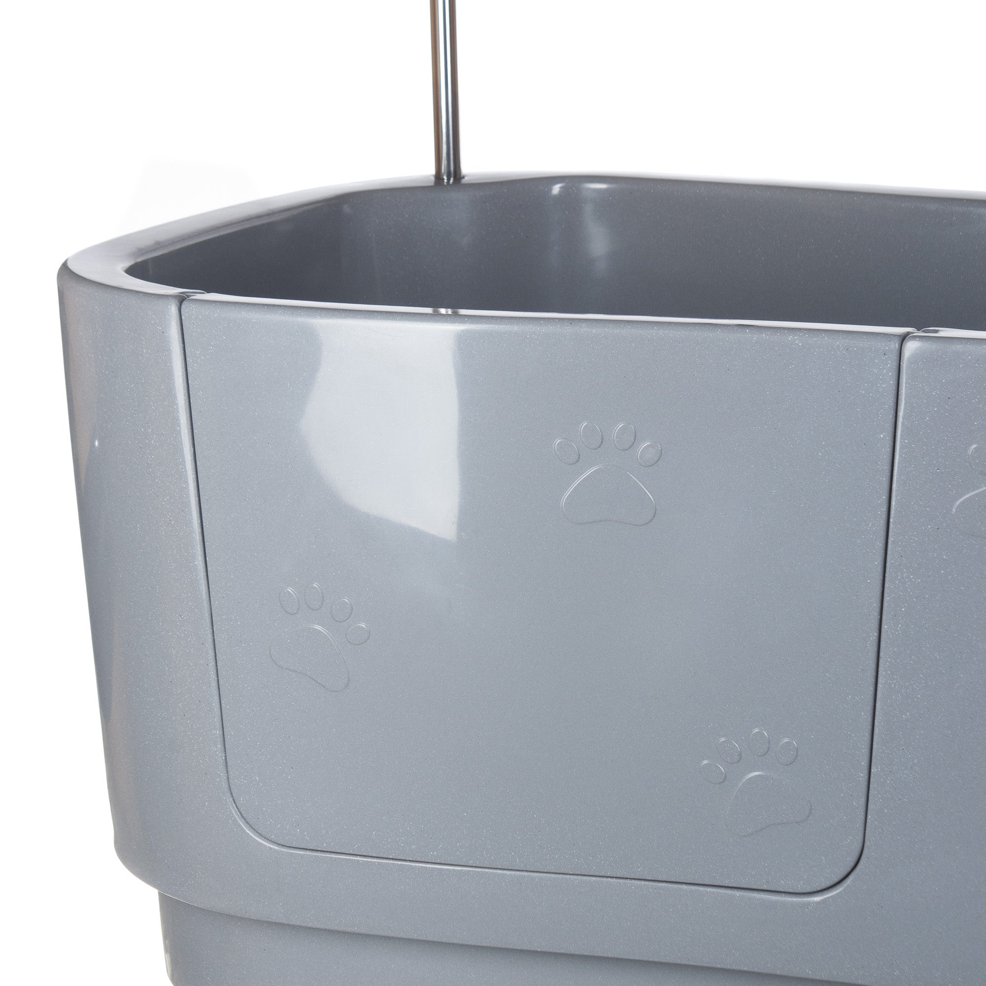 Liela, izturīga suņu kopšanas vanna ar plastmasas, noņemamu plauktu, kas atvieglo procedūras arī maziem četrkājainajiem draugiem, kā arī sānu durtiņām ērtai ieiešanai procedūrā. Izvelkamais rokturis aprīkots ar 3 pavadiņām. Ļoti vienkārša augstuma regulēšana ar kājas slēdžiem. Ļoti lielas vannas izmēri, pateicoties kuriem šeit var ievietot pat ļoti lielu četrkājaino draugu. Vannas malā ir organizators ar kosmētikas pudelēm. Vannas baseins ir ar neslīdošu dibenu. Visa konstrukcija ir ļoti stabila pat pie lielas slodzes, un pati vanna izgatavota no izturīga polipropilēna.