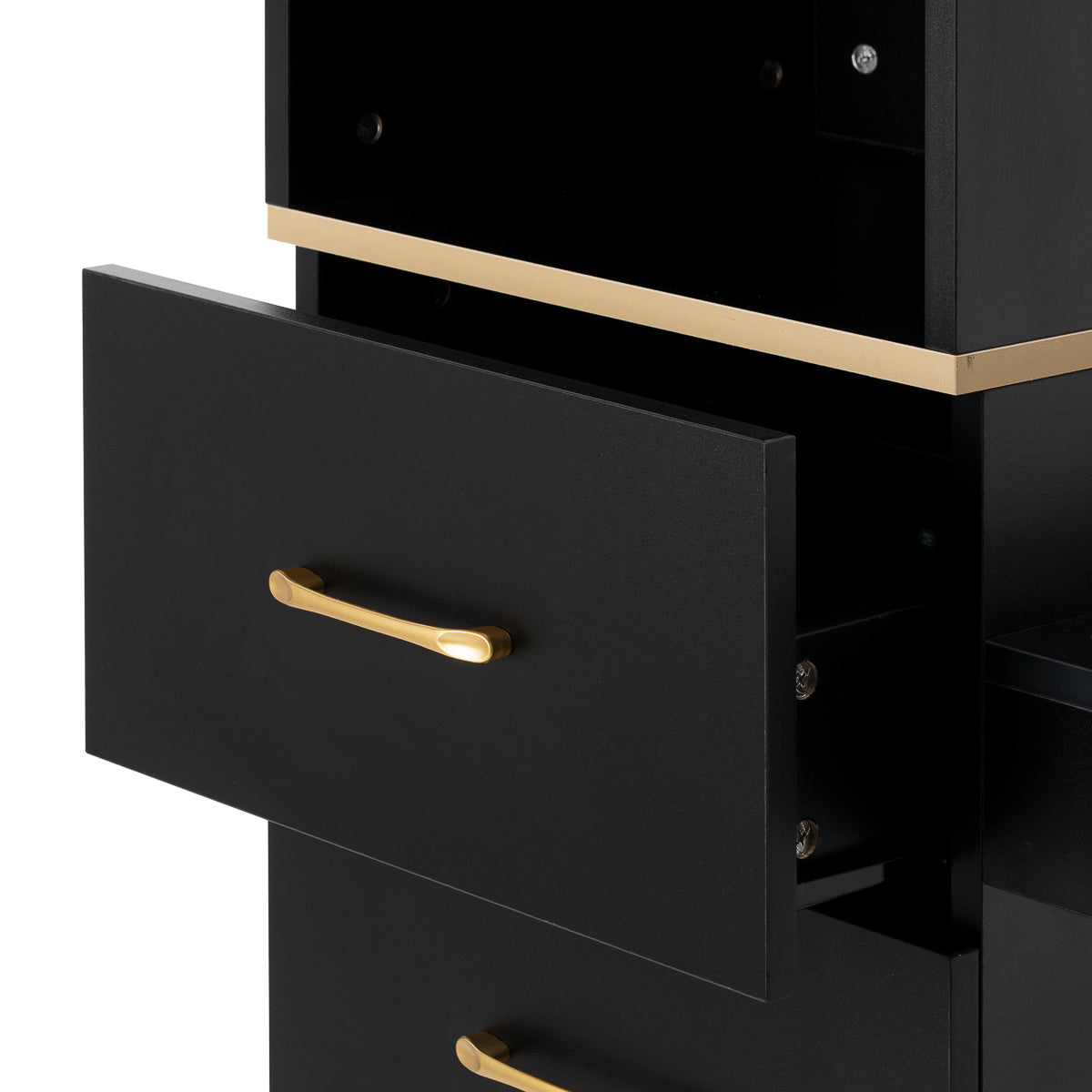 Stacijas dizains ir izstrādāts, lai atvieglotu stilista ikdienas darbu un nodrošinātu ērtu piekļuvi svarīgākajiem aksesuāriem. Aizslēdzamie skapīši un atvilktnes palīdz uzturēt kārtīgu izskatu, kamēr atvērta centrālā telpa nodrošina ātru piekļuvi visbiežāk lietotajiem piederumiem. Sānu plaukti palielina darba virsmu, ļaujot ērti uzglabāt stilizēšanas laikā izmantotos rīkus.