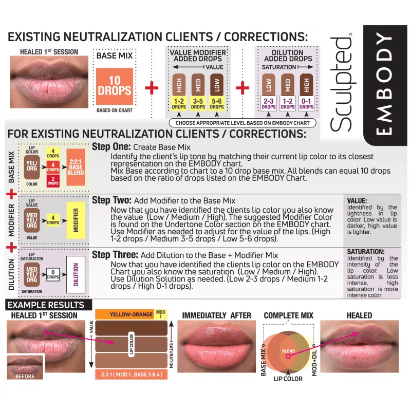 Šis daudzpusīgais komplekts ir piemērots visiem lūpu neitralizācijas veidiem — no visdziļākajām, tumšākajām vēsajām nokrāsām līdz siltākām, brūnām apakštonēm. Ar trim korektoriem komplektā jūs viegli varat pielāgot pigmentus, lai sasniegtu vēlamo efektu. Izmantojiet Embody komplektu sākotnējai neitralizācijai un kombinējiet to ar Carla Enhance pigmentiem turpmākām procedūrām, lai radītu satriecošu lūpu krāsas efektu.