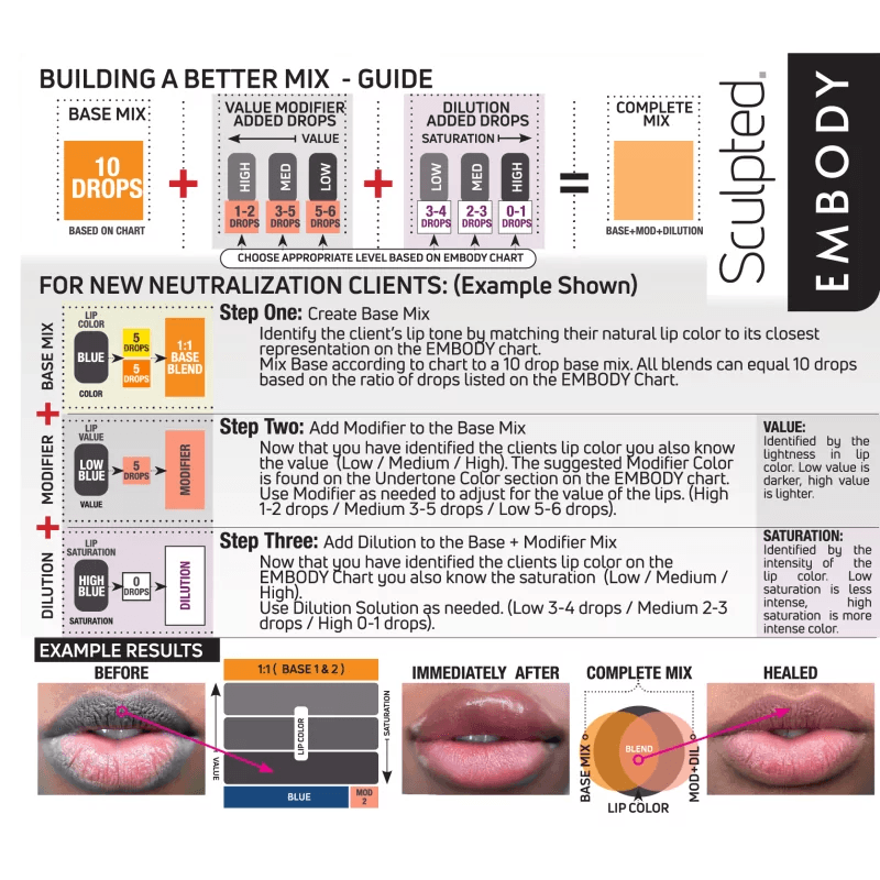 Ar Embody komplektu jūs varat sasniegt satriecošus rezultātus, ko raksturo precīza krāsas piesātinājums un ilgnoturība, atklājot bezgalīgas iespējas, kas atspoguļos jūsu klientu lūpu patieso potenciālu.