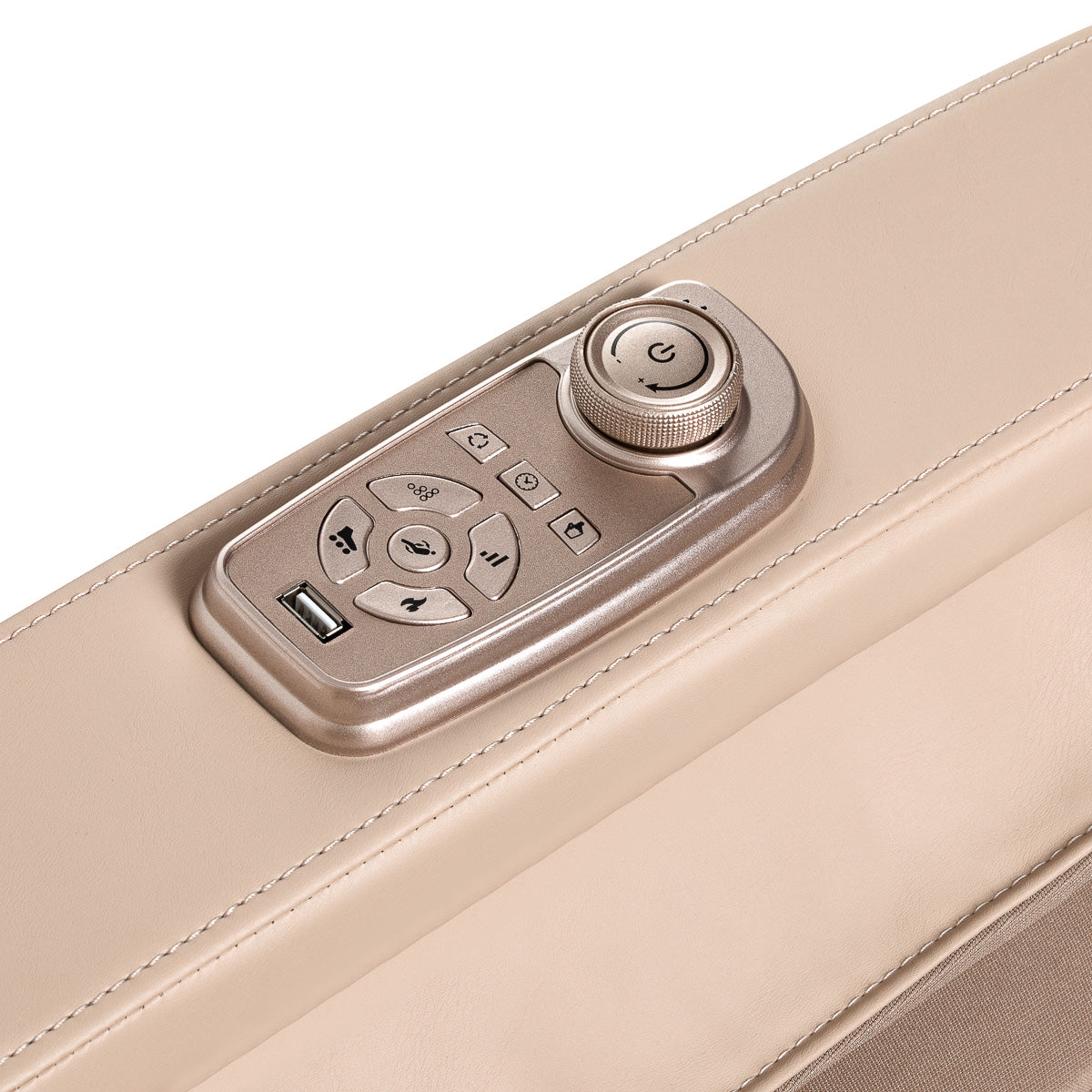 Vēl lielākam komfortam krēslam ir aprīkots vadības pogu komplekts, kas iebūvēts kreisajā roku balstā. Ērtā vadība ļauj ātri piekļūt svarīgākajām funkcijām, nepaceļot roku līdz galvenajam panelim. To var izmantot, lai vienkārši mainītu masāžas režīmu, sāktu pēdu masāžu vai aktivizētu Zero Gravity funkciju – viss ar maksimālu komfortu un patīkamu relaksāciju prātā. Tāpat ir aprīkots ar USB portu, kas ļauj uzlādēt telefonu masāžas laikā.