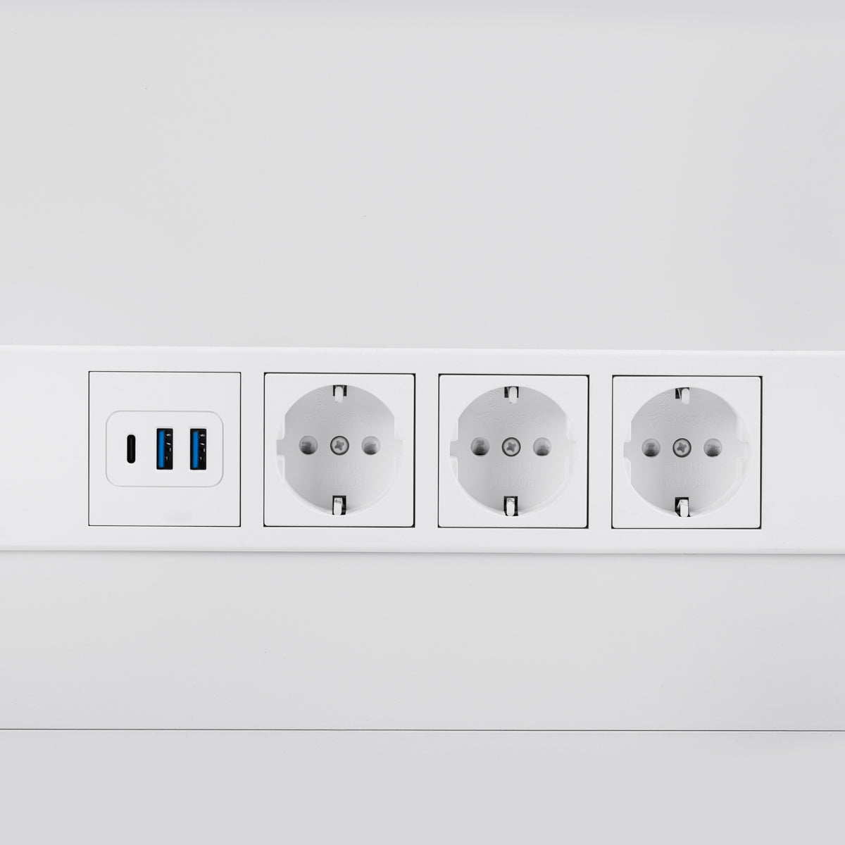 Asistentam ir aizmugurējā siena ar trim tīkla kontaktligzdām, diviem USB portiem un vienu USB-C portu, kas ļauj ērti pieslēgt dažādu veidu ierīces. Kabeļu caurumi, kas atrodas sienās pie augšējās atvilktnes, palīdz uzturēt kārtību. Iebūvētais palielināmās lampas turētājs ļauj droši piestiprināt lampas roku tuvu ārstēšanas vietai, neaizņemot vietu uz darba virsmas, veicinot precīzu apgaismojumu un ergonomisku darbu.