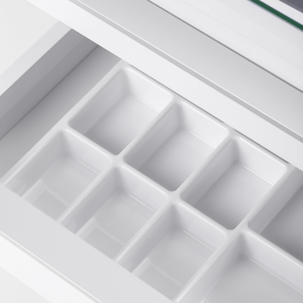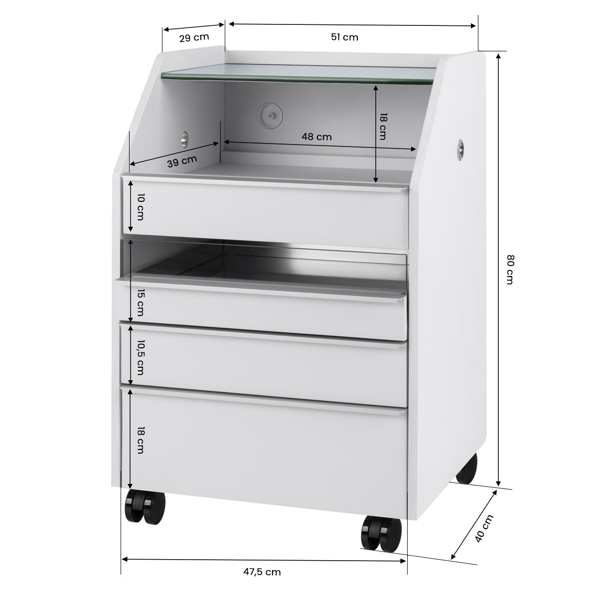 ērti glabāt visbiežāk lietotos piederumus. Skapis ir aprīkots ar četriem dažāda izmēra atvilktnēm, kas atvieglo kārtīgu instrumentu un kosmētikas līdzekļu glabāšanu. Vienas atvilktnes spoguļotais apakšējais nodalījums un speciāls iekšējais organizators palīdz labāk sakārtot instrumentus, nodrošinot ātru piekļuvi svarīgākajiem piederumiem un palielinot ērtības procedūru laikā. Augšējās atvērtās atvilktnes augstums ļauj novietot nepieciešamo aprīkojumu, piemēram, nagu urbjmašīnu ar slāpētāju.