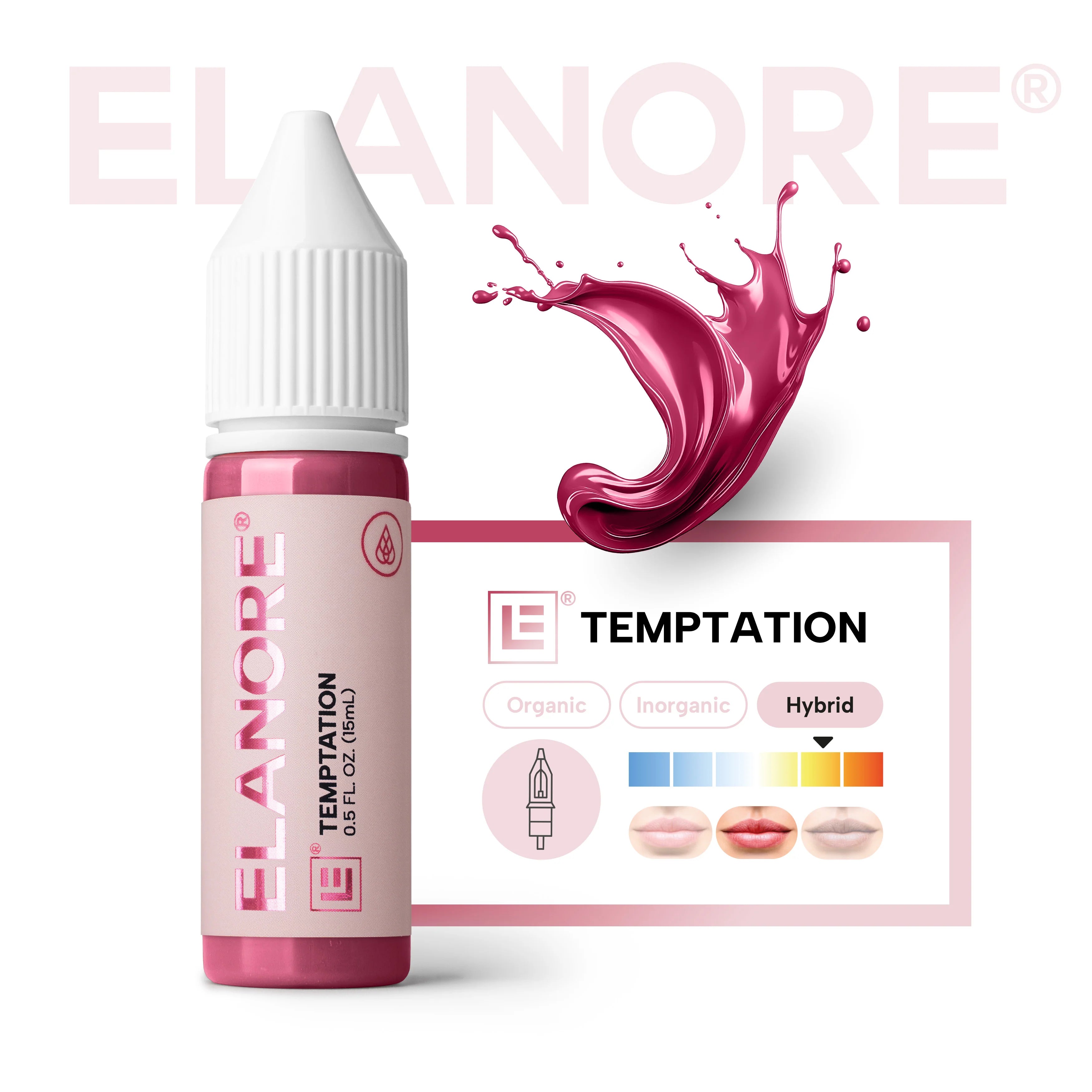 The Pigment x ELANORE Temptation ir hibrīda lūpu pigments, radīts PMU māksliniekiem, kuri meklē intensīvu, pievilcīgu sarkani rozā toni ar mūsdienīgu ziedu pieskārienu. Šis izteiksmīgais tonis uzreiz piesaista uzmanību lūpām, piedāvājot vilinošu, izteiksmīgu izskatu, kas lieliski der gan smalkai uzlabošanai, gan drosmīgām lūpu sārtuma transformācijām. Neatkarīgi no tā, vai nepieciešams pārklāt dziļākus lūpu toņus vai neitralizēt vēsas apakštones, Temptation pigments nodrošina dzīvīgu piesātinājumu ar kontrolētu, profesionālu konsekvenci.