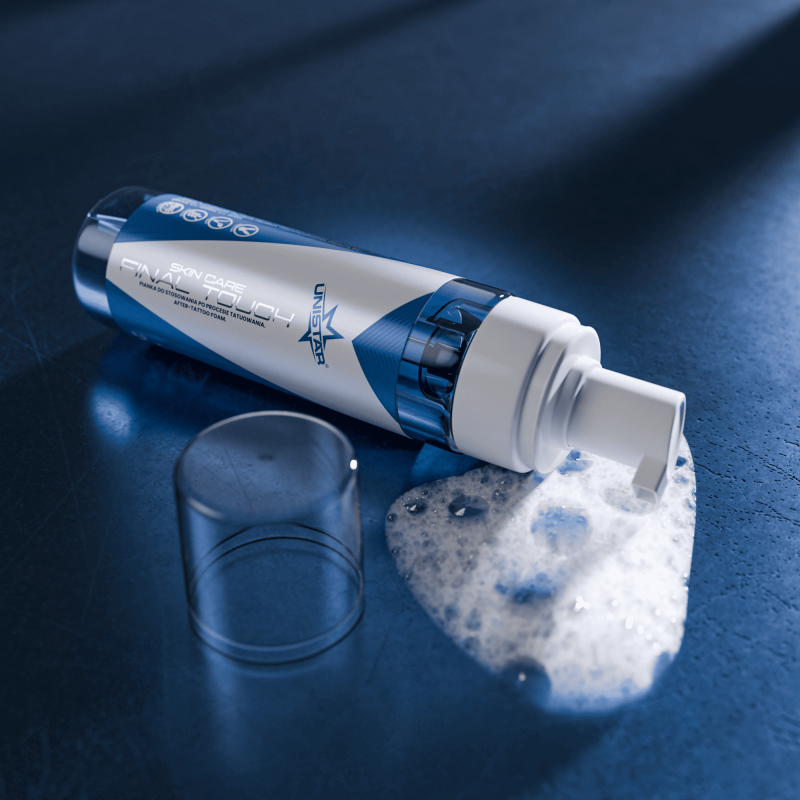 Unistar Skin Care Final Touch is a professional foam cleanser developed for the final stage of the tattooing process. It removes ink residue, petroleum jelly, and other products without disturbing the skin’s natural hydrolipid barrier.