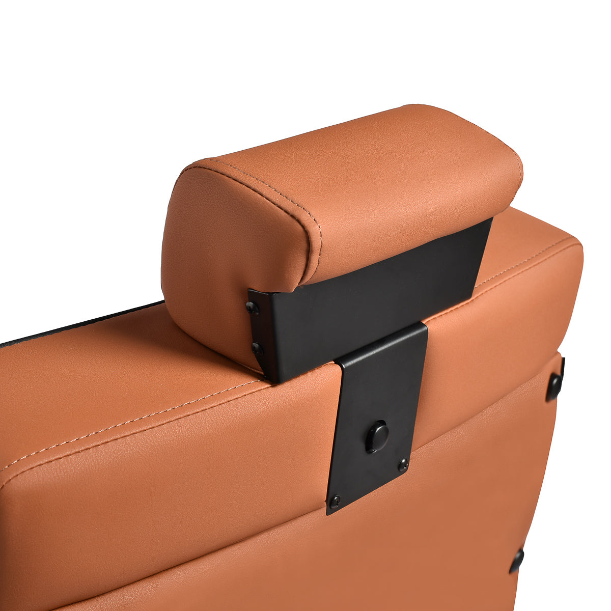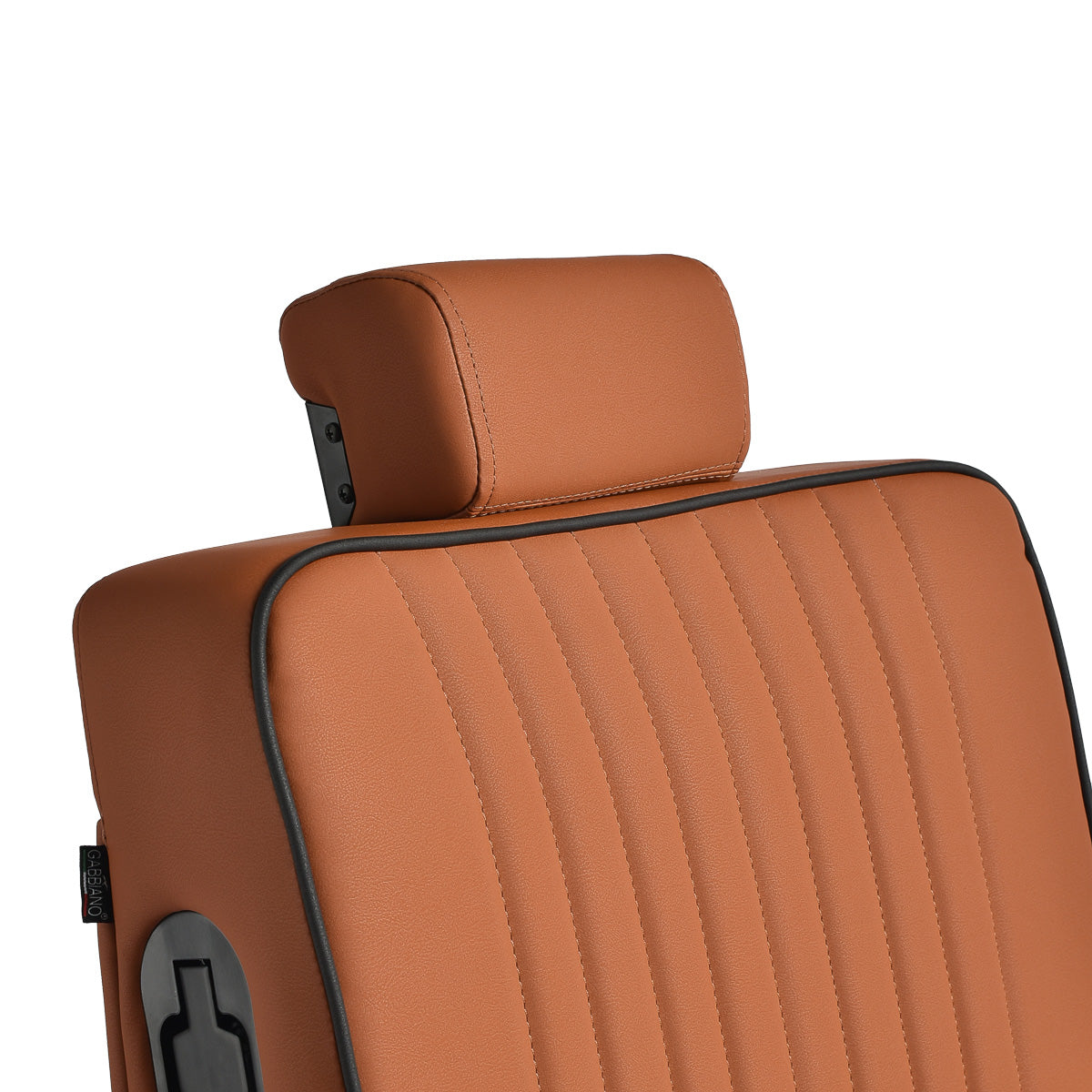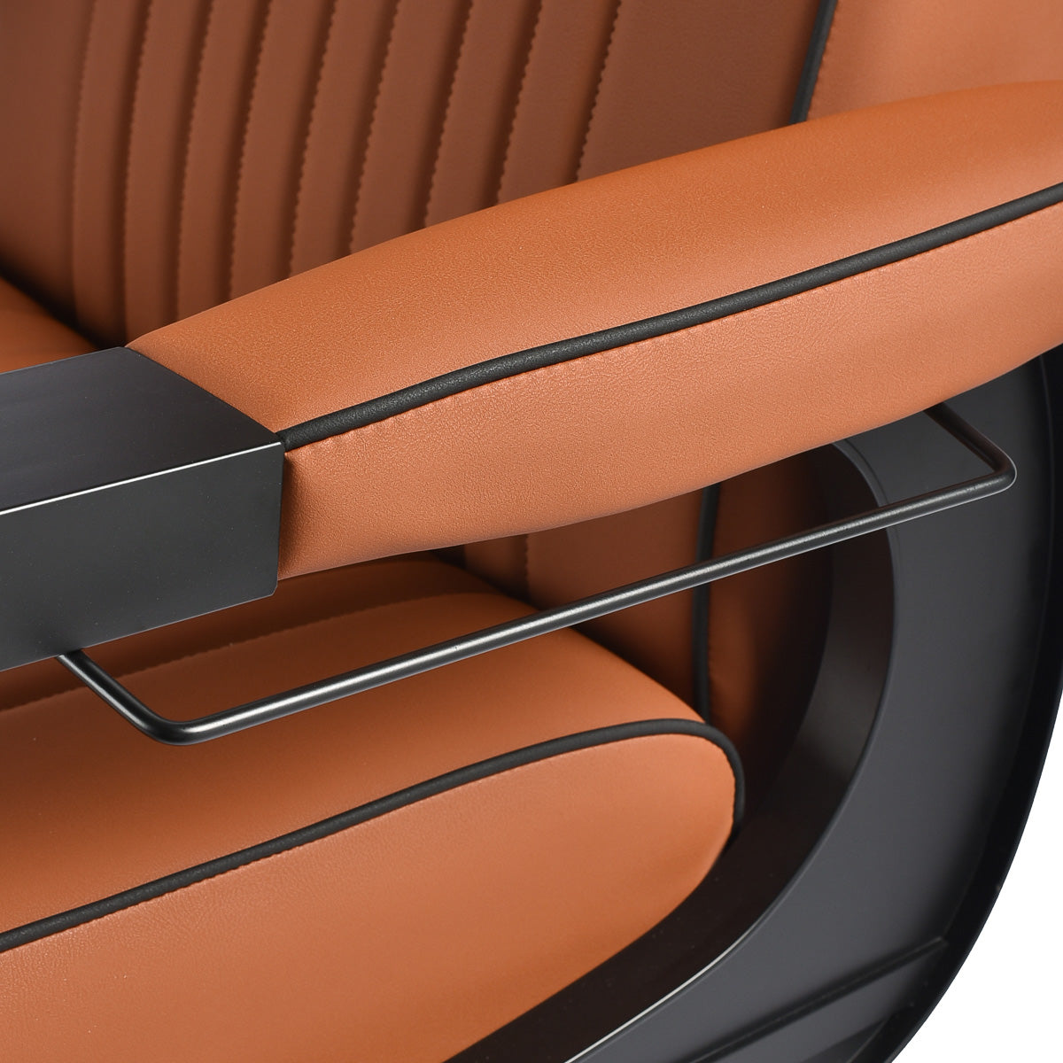 Чёрное, круглое основание обеспечивает устойчивость и долговечность. Мягкая матовая обивка из синтетической кожи сочетает комфорт с прочностью. Используемые материалы влагостойкие, долговечные и легко очищаемые. Стильная прострочка и обивка коричневых тонов придают изделию уникальный характер, идеально дополняя интерьер современных барбершопов. Сочетание элегантного цвета обивки с чёрным каркасом и основанием подчёркивает современный, профессиональный вид кресла.