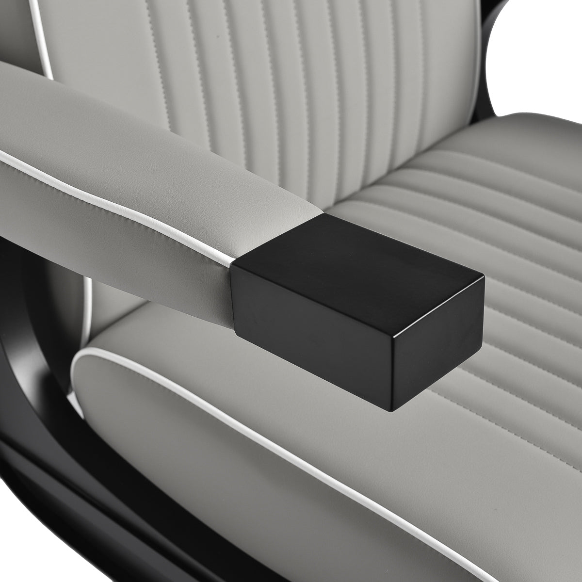 Чёрное, круглое основание обеспечивает устойчивость и долговечность. Мягкая, матовая обивка из синтетической кожи сочетает комфорт с прочностью. Используемые материалы влагостойкие, долговечные и легко очищаются. Стильная прострочка и обивка серых тонов придают изделию уникальный характер, идеально дополняя интерьер современных барбершопов. Сочетание элегантного цвета обивки с чёрным каркасом и основанием подчёркивает современный, профессиональный вид кресла.