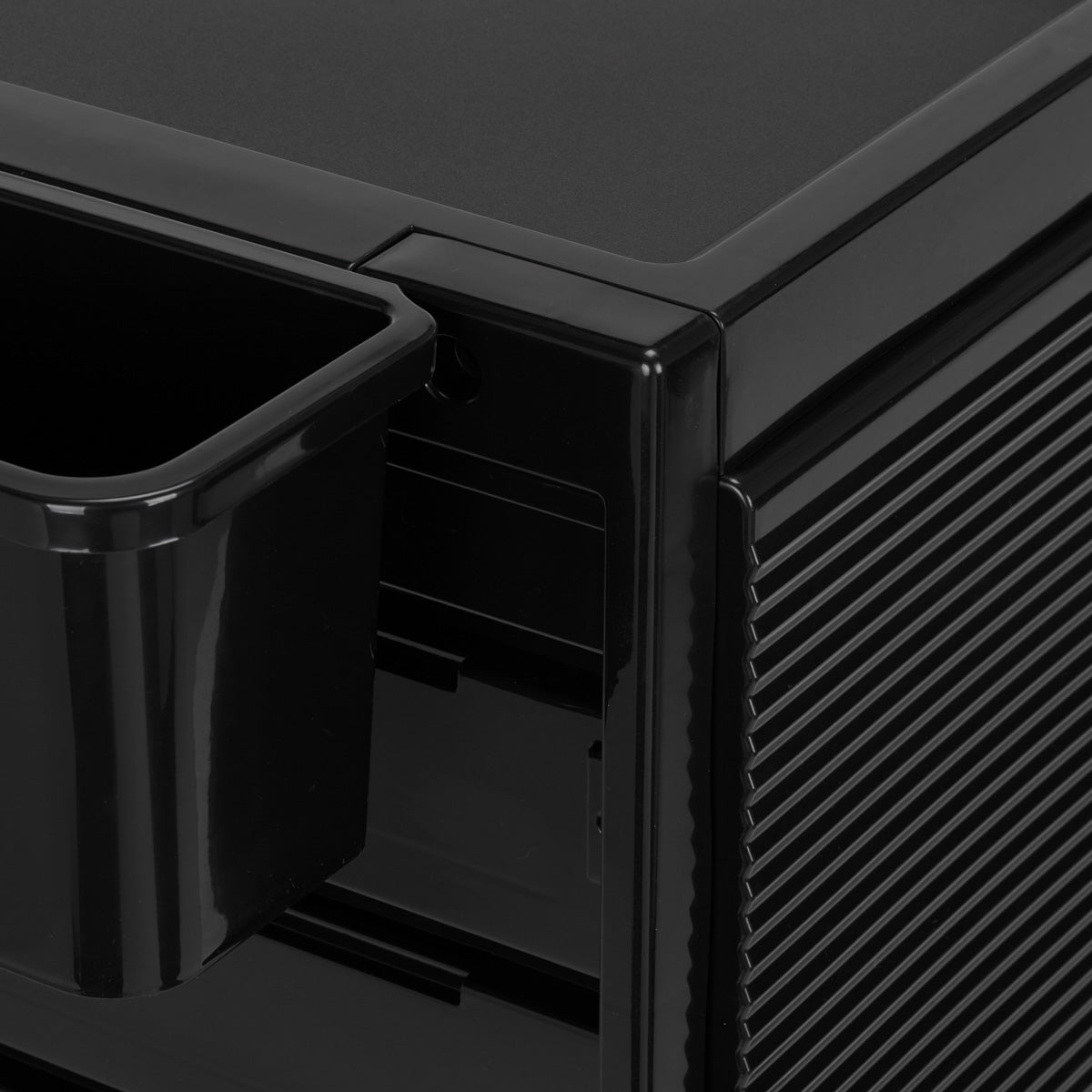 Вместительный органайзер оснащен набором лотков для хранения, которые помогут обеспечить порядок на рабочем месте, рассортировав инструменты, необходимые для работы парикмахера. В набор входят шесть контейнеров: два без перегородок, два с перегородками и два узких и глубоких. Их расположение в органайзере можно свободно менять по желанию, чтобы подстроить под собственные нужды, а большой выбор различных типов ящиков позволяет разделять принадлежности по своему усмотрению. Кроме того, два самых глубоких лотка можно разместить на разной высоте по бокам помощника, чтобы инструменты, помещенные в них, всегда находились на нужном уровне. Прилагаемая задняя панель предотвращает случайное выдвижение ящиков в другую сторону, что могло бы привести к повреждению инструментов внутри.