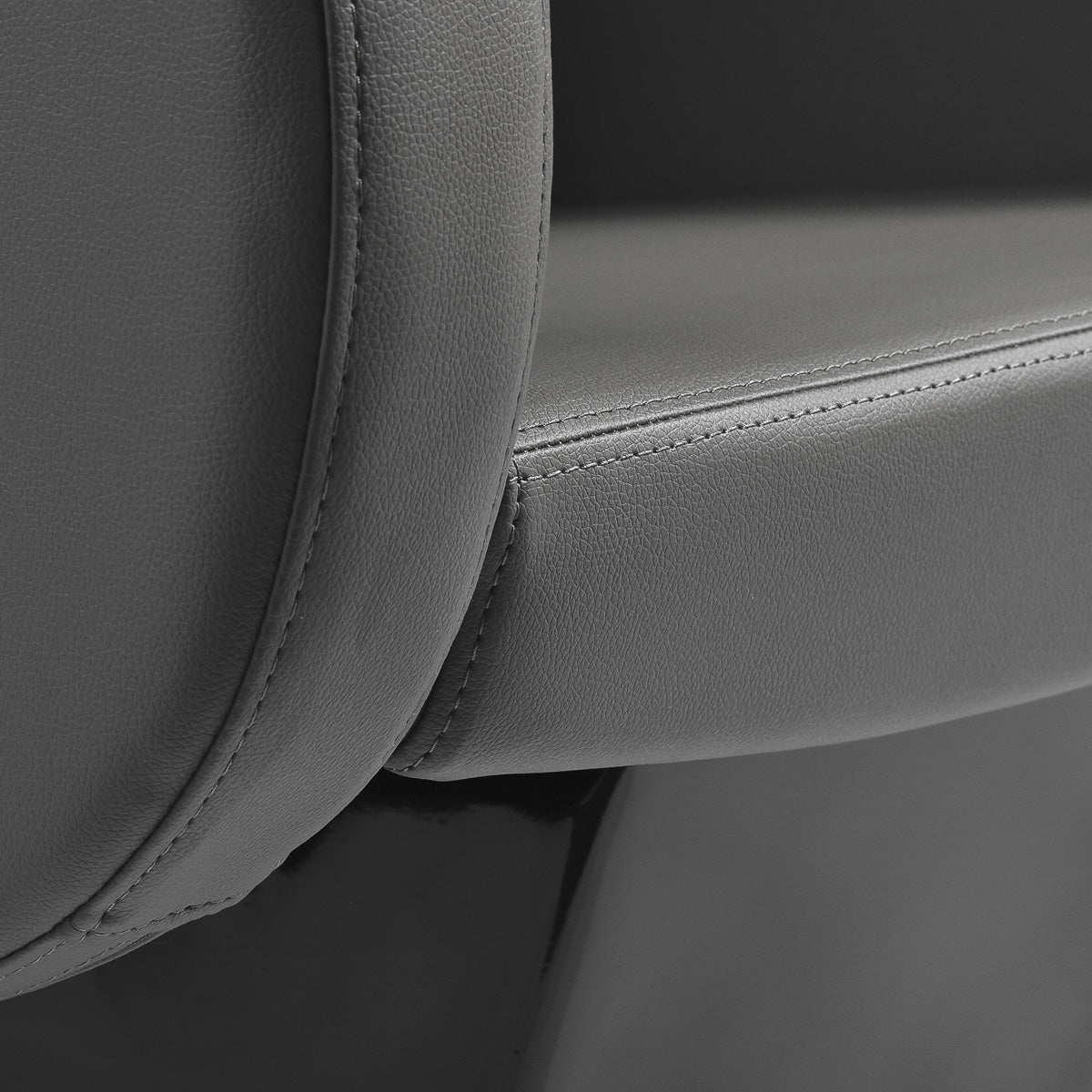 Кресло, наполненное прочной пеной, гарантирует высокий комфорт, а впечатляюще профилированные подлокотники обеспечивают удобное положение плеч. Спинка под оптимальным углом поддерживает позвоночник, обеспечивая полное расслабление. Обивка из синтетической кожи в оттенках серого гарантирует долговечность и легкость в уходе. Современная форма мебели подчеркивает элегантный характер интерьера. В комплект входит полный набор фурнитуры с матовым покрытием в черных тонах, включая кран, душевую лейку и соответствующие шланги, обеспечивающие полный набор инструментов для работы.
