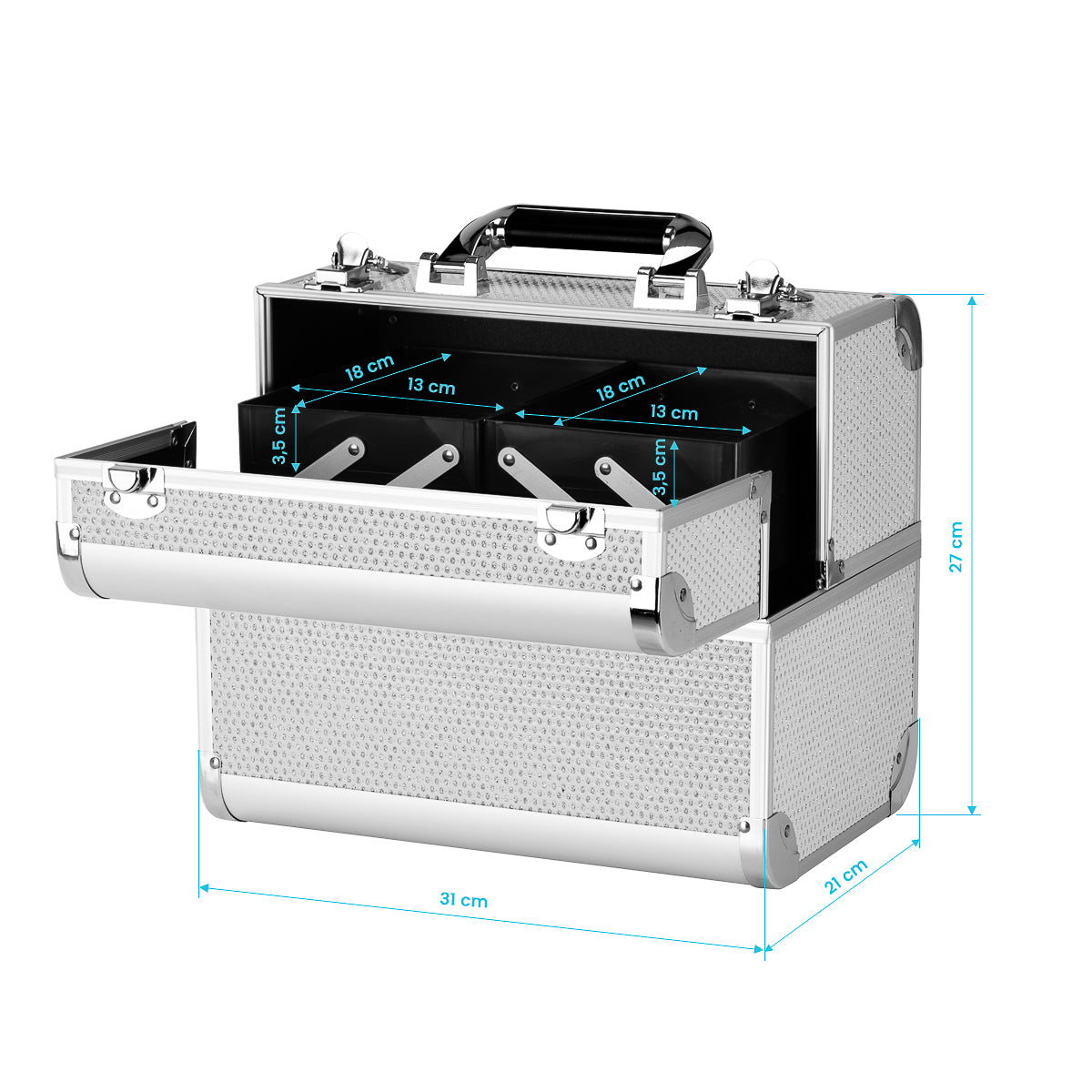Современный дизайн в оттенках серебра с блестящими акцентами добавляет элегантности. Ручка облегчает транспортировку, что особенно важно для мобильных стилистов. Изготовлен из прочных, устойчивых к повреждениям материалов, он обеспечивает комфорт при ежедневном использовании. Надежный замок с ключом защищает содержимое, а легкая и прочная конструкция делает кейс удобным для переноски.