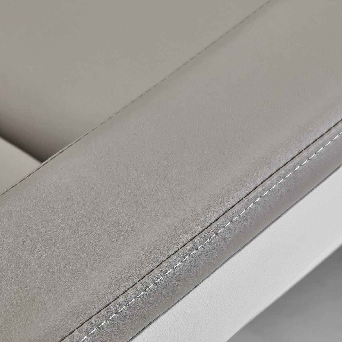 Кресло наполнено пеной соответствующей жесткости и обтянуто приятной на ощупь искусственной кожей в оттенках серого. Благодаря использованию материала, который легко содержать в чистоте и который устойчив к выбранным дезинфицирующим средствам, оборудование удобно в использовании, устойчиво к влаге и легко очищается. Прочная база из долговечного белого материала обеспечивает устойчивость во время процедур. Правильно профилированные кромки придают креслу стильный вид и делают сиденье эргономичным.