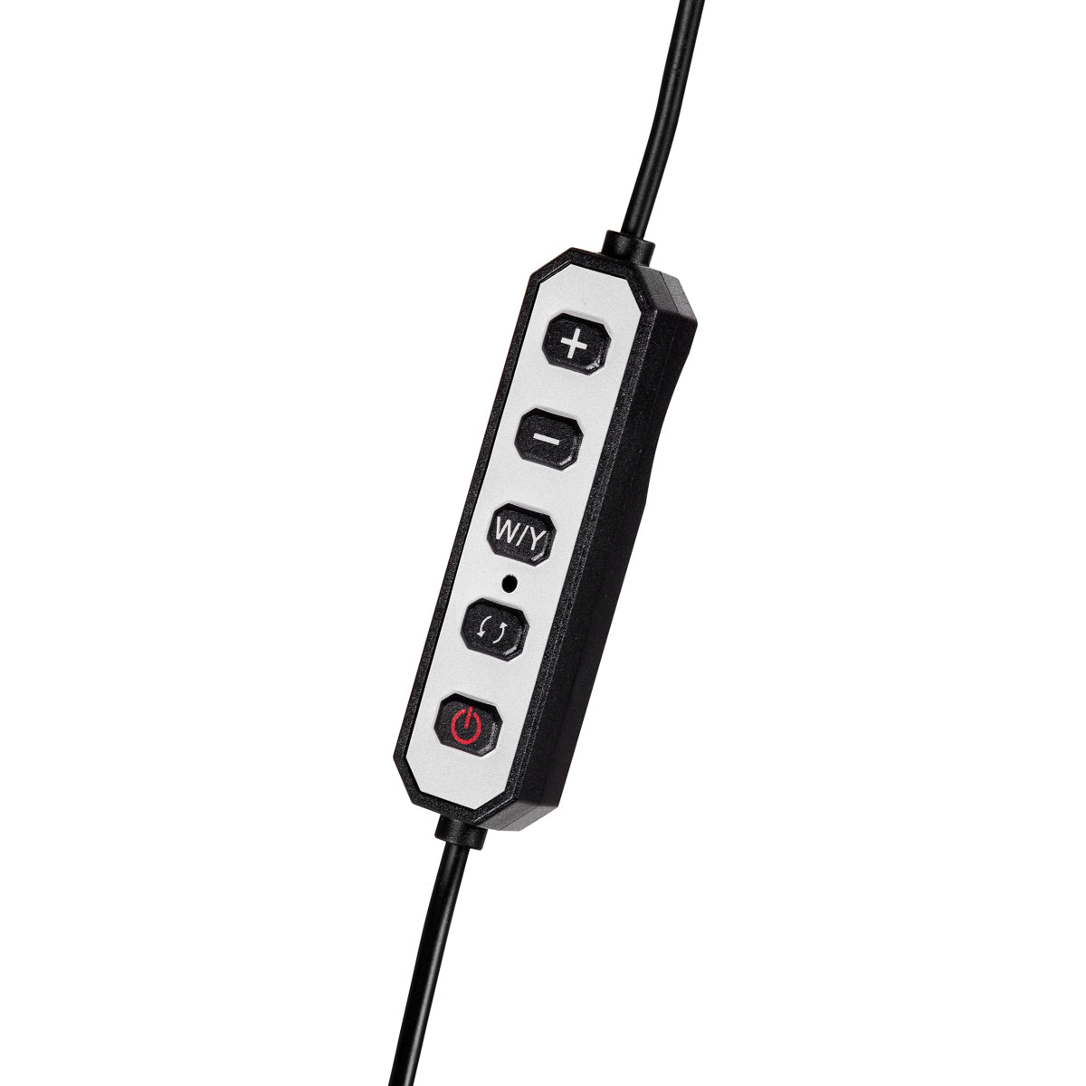 Стойка легко регулируется в диапазоне 140-180 см с помощью фиксирующего винта на руке. Это позволяет настроить положение головки под индивидуальные потребности и различные типы косметических кресел, шезлонгов или процедурных столов, одновременно отлично освещая рабочее место. Цвет и интенсивность света можно постепенно регулировать с помощью пультов управления — один расположен прямо рядом с лампой, благодаря чему всегда под рукой во время работы; второй позволяет управлять настройками на расстоянии.