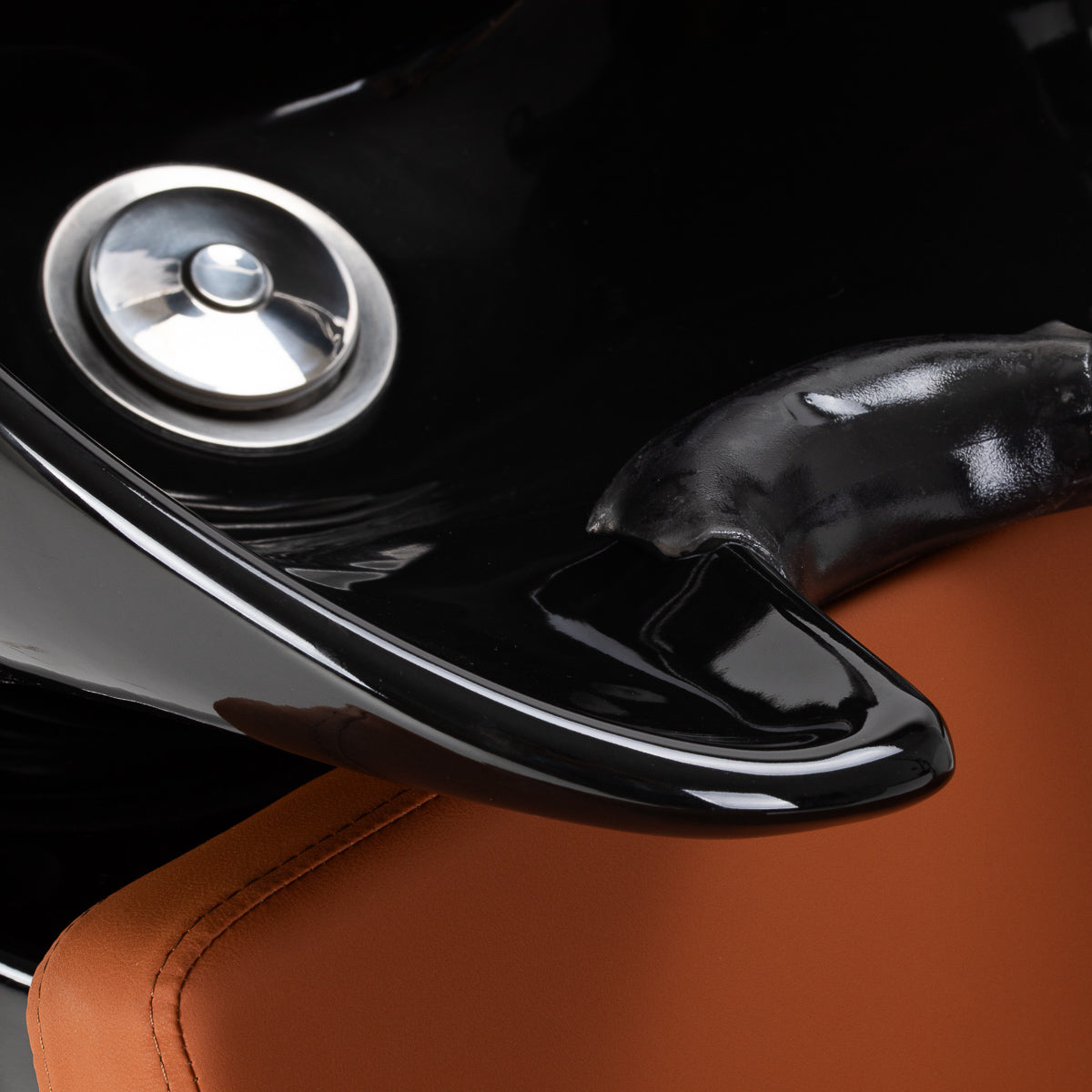 Геометрически оформленное кресло объединяет современную простоту с удобством использования. Сиденье и подлокотники с плавными углами создают гармоничное целое, обеспечивая удобное положение во время процедур, а спинка с оптимальным углом наклона поддерживает правильную осанку и способствует расслаблению. Обивка из высококачественной искусственной кожи коричневых оттенков устойчива к износу и влаге, а также легко очищается. Простая, современная форма мебели подчеркивает элегантный характер мойки, а полный комплект оснащения — смеситель, душевая лейка и специальные шланги — обеспечивает полный набор инструментов для работы.