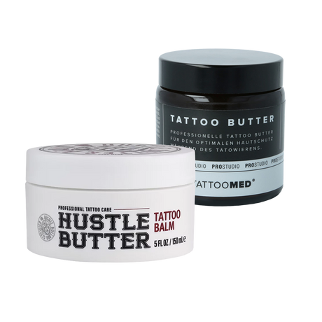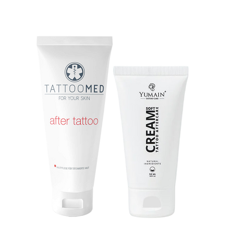 Ассортимент может включать кремы, бальзамы, спреи, пенки, очищающие средства и защитные растворы, подобранные для поддержания комфорта кожи, гигиены и её состояния после нанесения татуировки. Средства выбираются согласно профессиональным протоколам ухода и рекомендациям тату-мастеров.