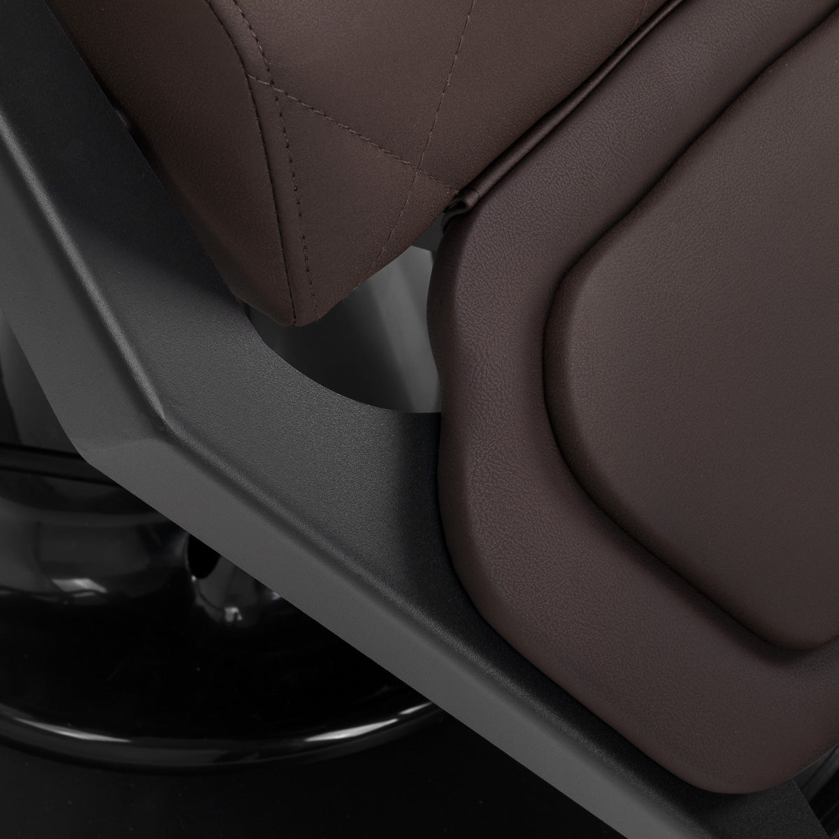 Эргономичный дизайн сиденья и тщательно профилированная спинка обеспечивают комфорт клиента даже во время длительных процедур. Обитые подлокотники, установленные на оптимальной высоте, позволяют правильно расположить руки клиента, предотвращая напряжение в области шеи и плеч. Механизм полного вращения увеличивает гибкость работы и позволяет легко регулировать кресло в любое положение.