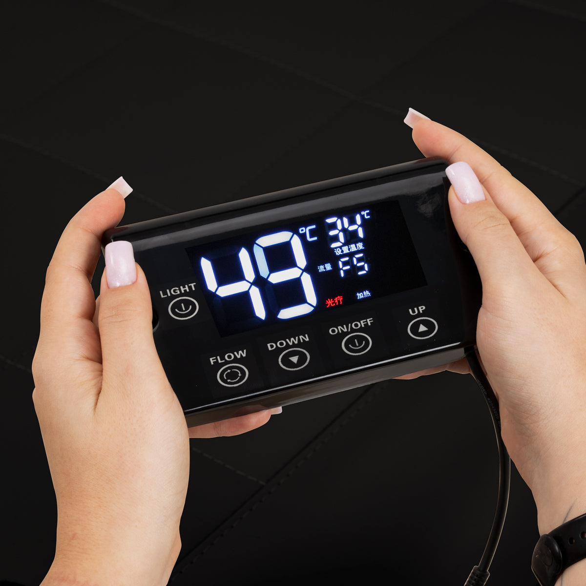 Интуитивно понятная сенсорная панель позволяет полностью контролировать параметры процедур и обеспечивает удобство использования. Она позволяет регулировать время работы и температуру воды, а также отслеживать их текущие значения на чётком, легко читаемом дисплее. Кроме того, панель позволяет активировать функцию светотерапии, которая освещает чашу, создавая атмосферу расслабления и роскоши. В комплект также входит пульт дистанционного управления, который позволяет удобно управлять паровым устройством на расстоянии.