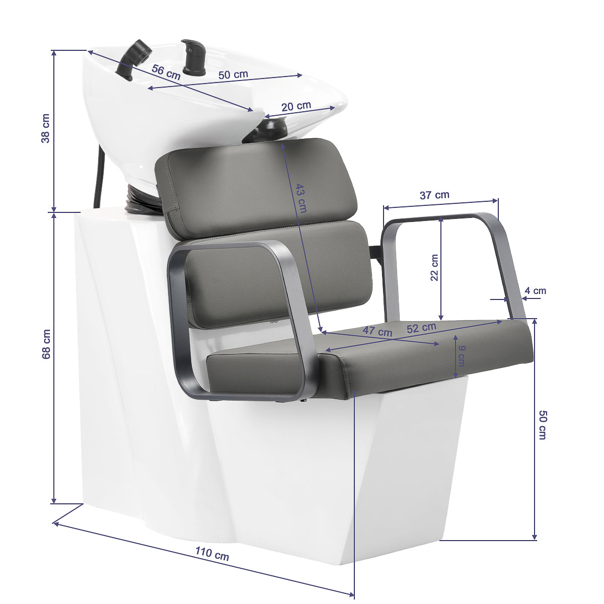 Профилированное кресло обеспечивает адекватную поддержку поясницы и, следовательно, высокий комфорт использования. Металлические подлокотники в оттенках серого с геометрической формой позволяют правильно позиционировать плечи клиента. Наполнение из прочной, устойчивой к деформации пены и обивка из приятной на ощупь синтетической кожи в оттенках серого обеспечивают долговечность мебели, легкость ухода и комфортное использование на протяжении длительного времени. Оригинальный, элегантный внешний вид парикмахерской мойки придает интерьеру уникальное выражение. В комплект входят полные фитинги в черных оттенках, включая смеситель, душевую лейку и специальные шланги, чтобы обеспечить полный набор инструментов для работы.