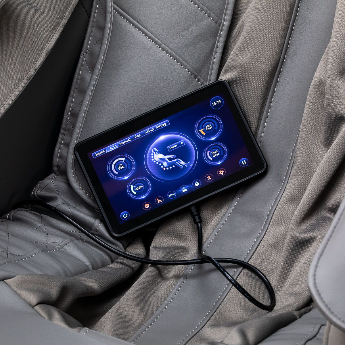 Панель управления позволяет легко настроить массаж под ваши индивидуальные потребности. Для удобства её можно разместить в держателе на правом подлокотнике или держать в руках. Экран чётко отображает всю ключевую информацию — части тела, которые массируются в данный момент, интенсивность массажа, продолжительность сеанса и выбранную программу. Панель позволяет переключаться между автоматическим и ручным режимами и активировать голосовое управление, повышая комфорт использования. С её помощью удобно выбирать доступные режимы массажа, регулировать интенсивность, настраивать параметры кресла и точно устанавливать время сеанса с шагом 5 минут (5, 10, 15, 20, 25 или 30 минут), обеспечивая идеальную продолжительность массажа, адаптированную к потребностям пользователя.