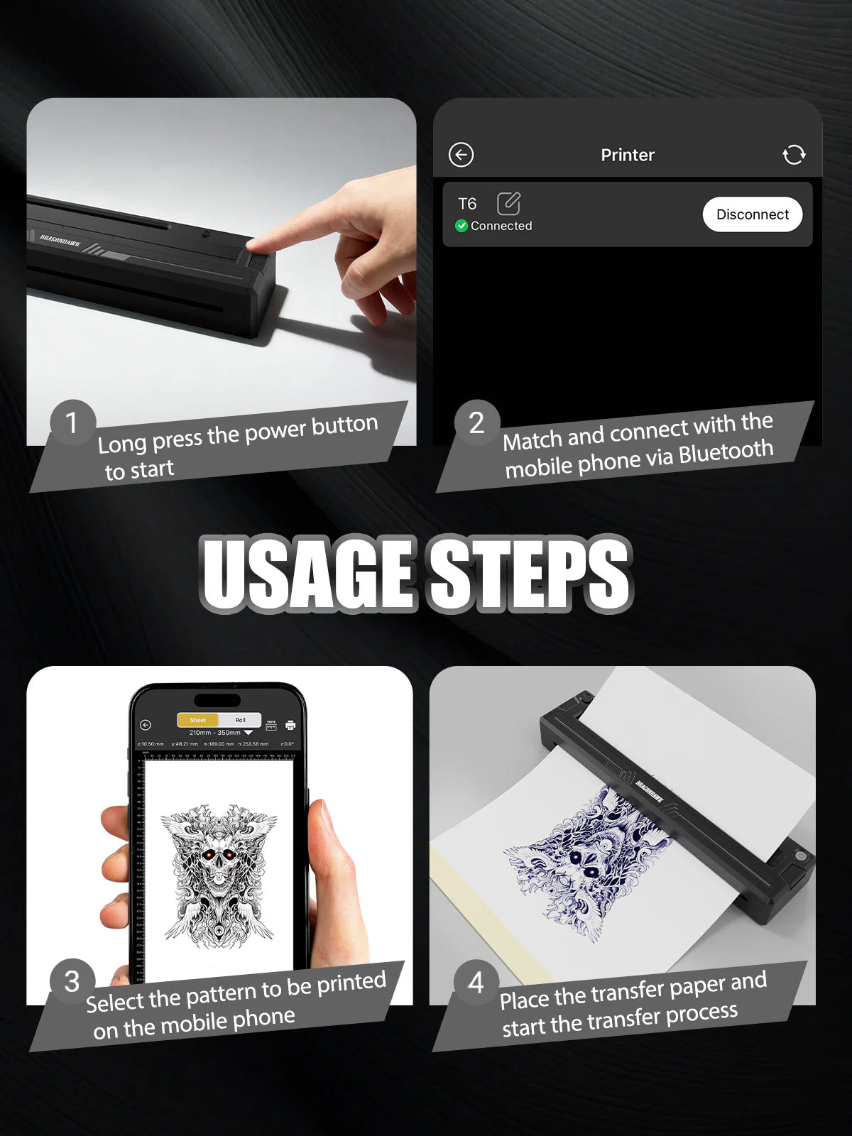 Беспроводной термопринтер трафаретов DragonHawk A4 — компактный, высокопроизводительный портативный принтер трафаретов, разработанный для профессиональных тату-мастеров, которым нужны быстрые, точные и надежные передачи трафаретов. Благодаря подключению по Bluetooth и совместимости с несколькими устройствами, этот аппарат позволяет печатать напрямую со смартфонов, планшетов или компьютеров.