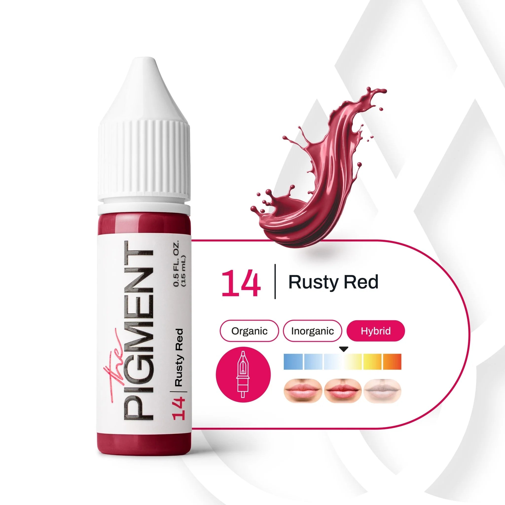14 Rusty Red — тёплый гибридный пигмент для губ с земляным красным подтоном, вдохновлённым естественным теплом терракоты. Этот оттенок даёт уверенный, насыщенный красный с мягким деревенским характером — идеально подходит для PMU-мастеров, создающих выразительные, но естественно приземлённые результаты на губах.